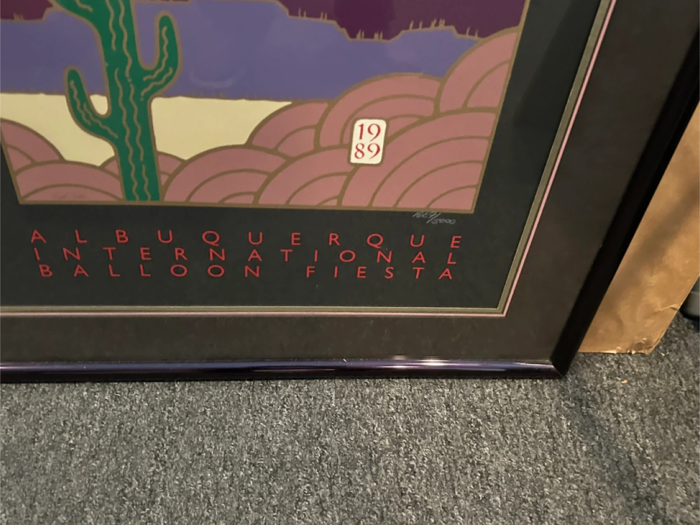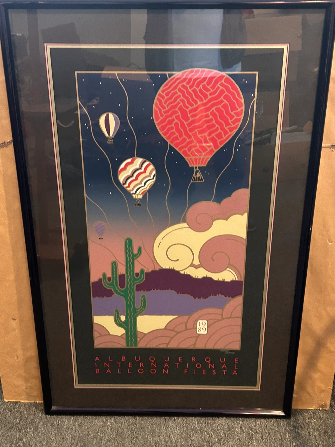 Selling a framed art piece featuring the 1989 Albuquerque International Balloon Fiesta. It showcases a vibrant design with hot air balloons and a desert landscape. The art is framed signed and ready to hang, perfect for adding a touch of Southwestern charm to your home