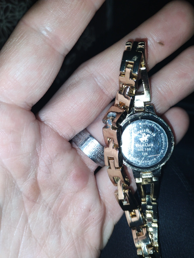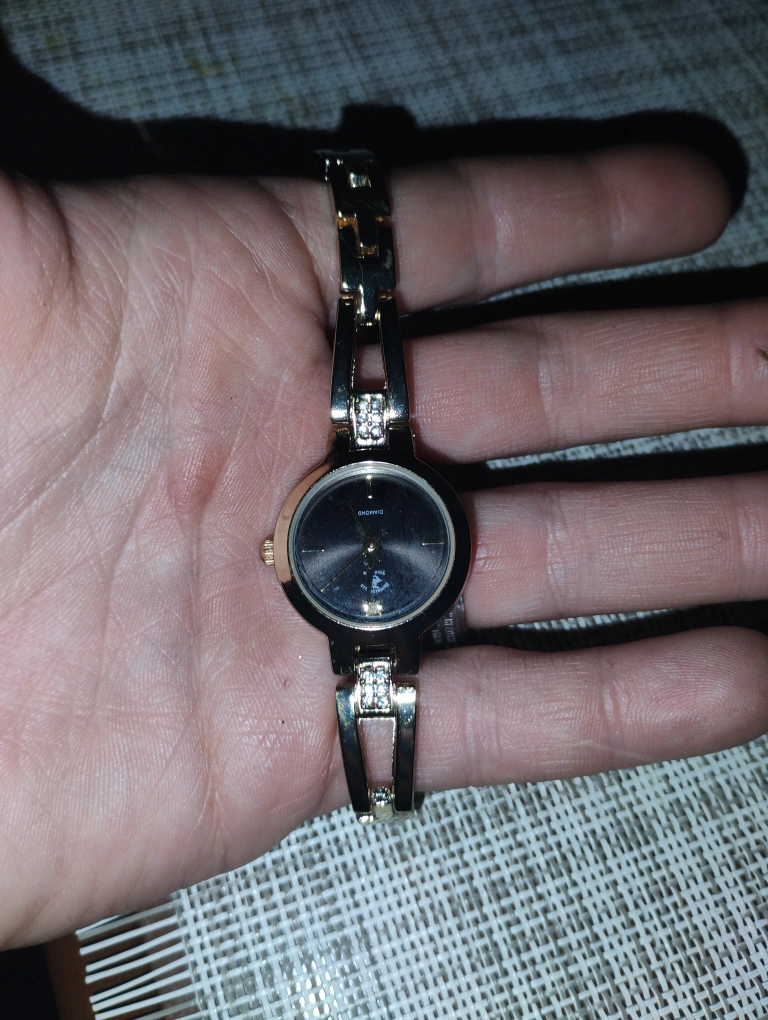 Selling a l watch with diamond accents! It has a gold-tone band and a black face. The back of the watch has the model number BFL 100/124. It's in good condition and ready for a new owner