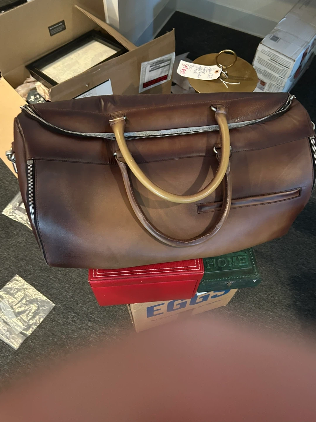 This is a brown leather duffle bag haz a suit compartment and room for other things. It has a zipper and handles and shoulder strap. Feel free to message me if you're interested!