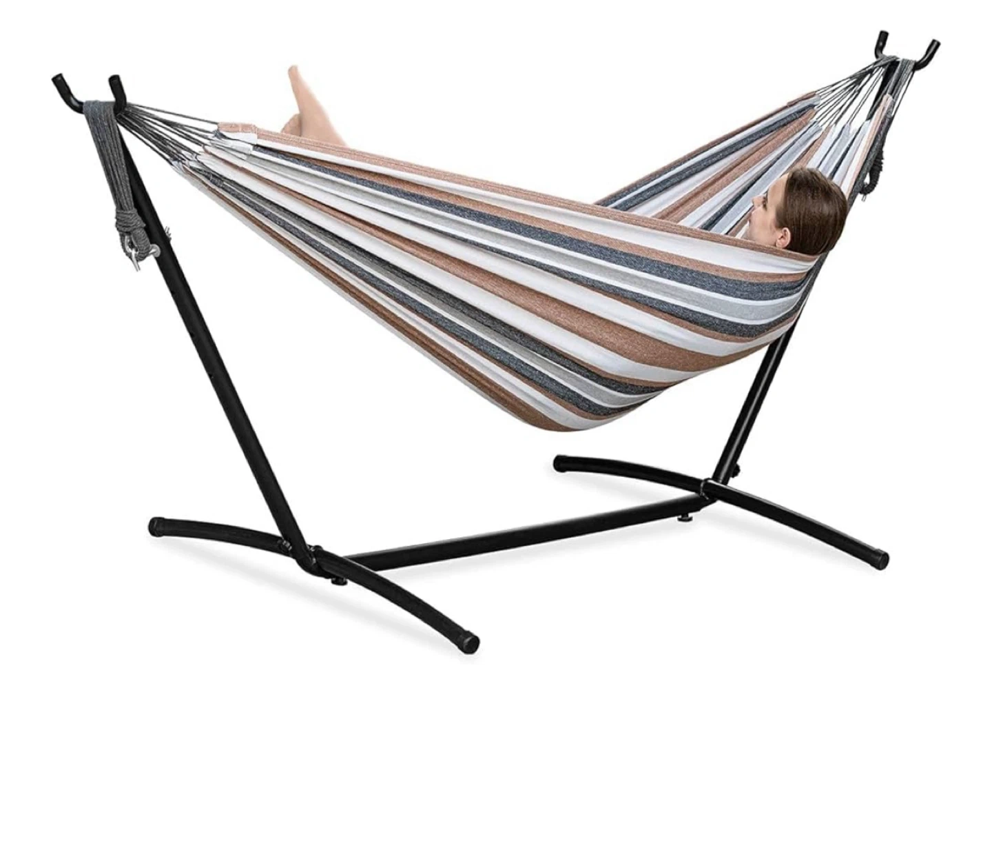 Here's a comfy striped hammock with a sturdy stand! Perfect for relaxing outdoors. The stand is black and easy to assemble.
