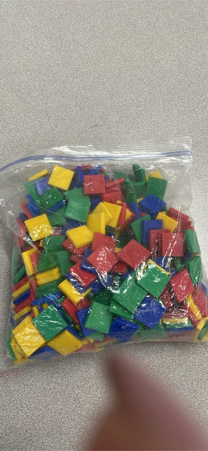 I have a bag of colorful square tiles. Great for crafting or educational projects!