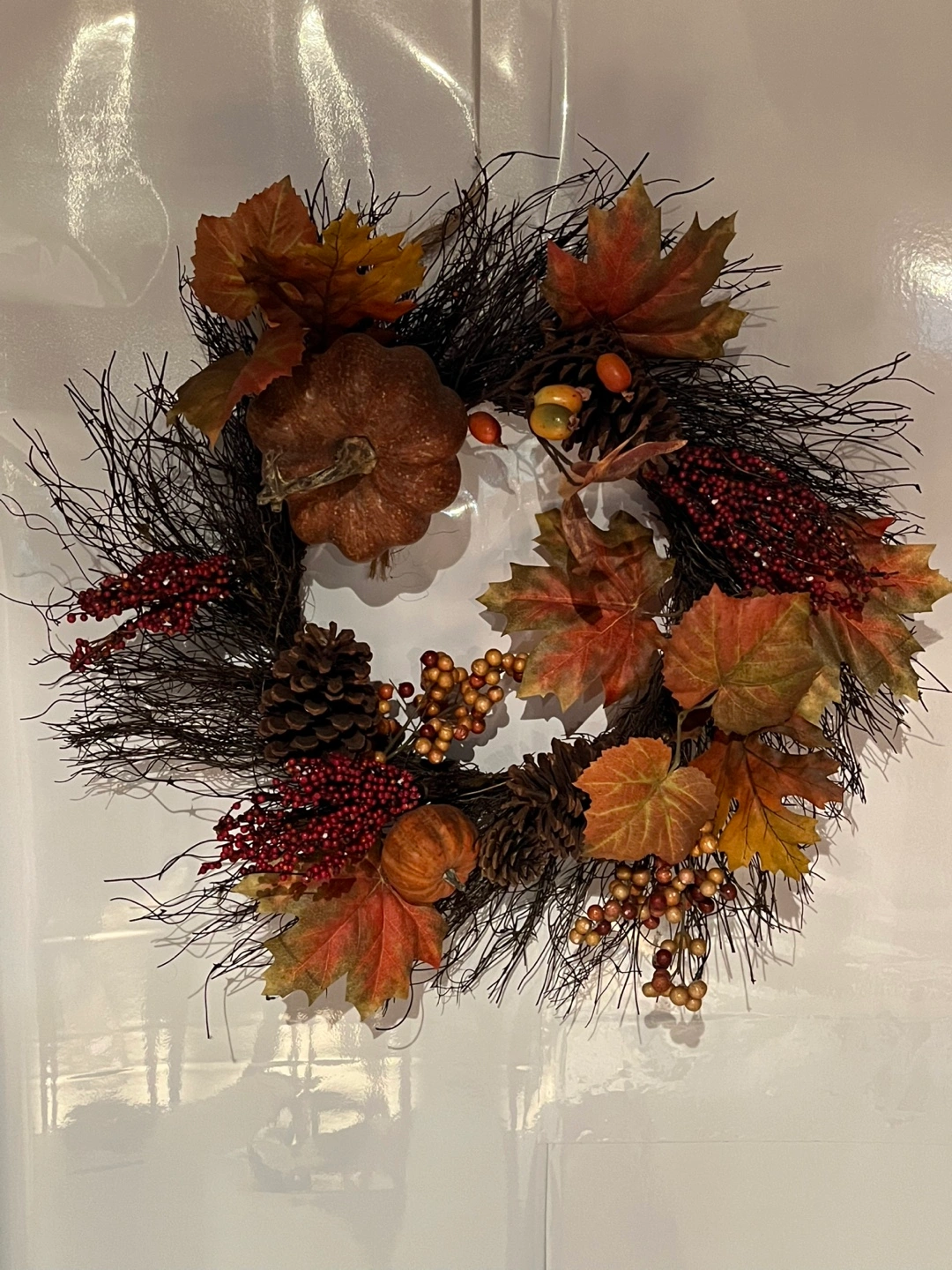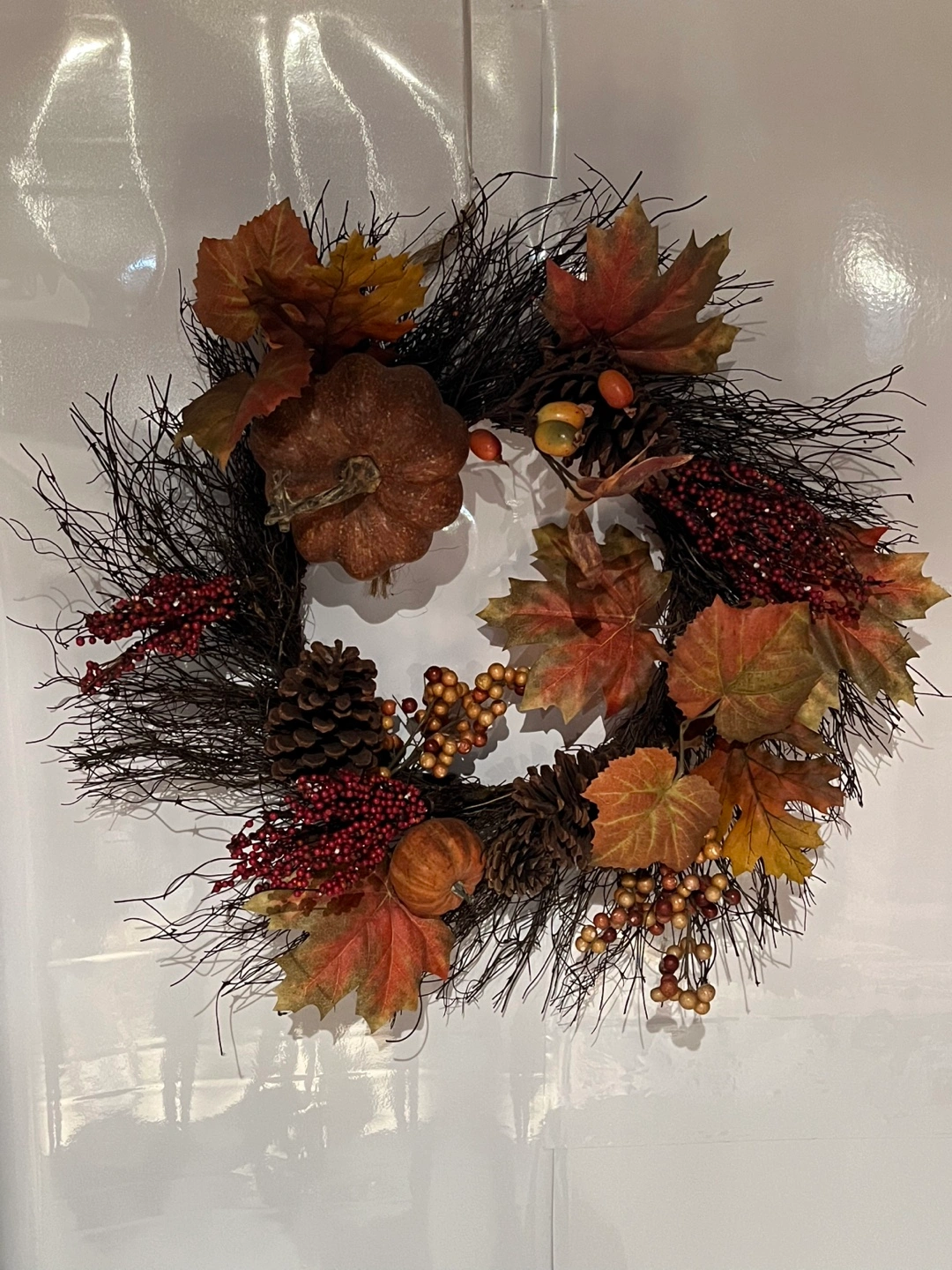 Beautiful fall harvest wreath featuring leaves, pumpkins, pinecones, and berries! It's perfect for adding a touch of autumn to your home