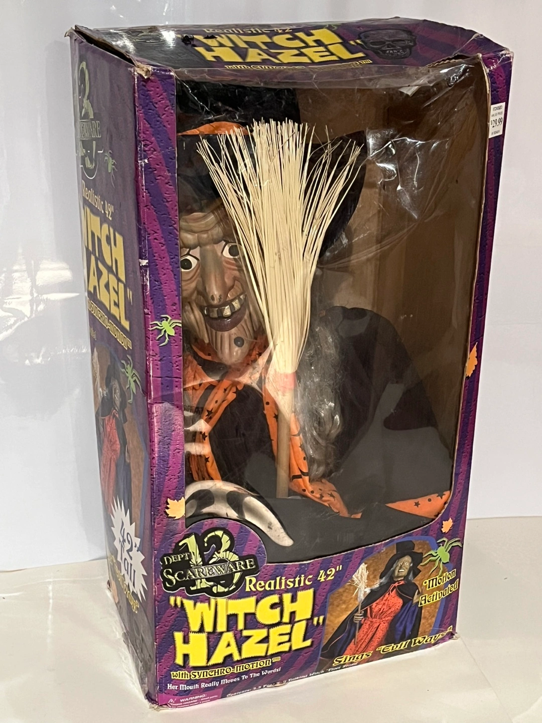 Selling a Dept 13 Scareware Realistic 42" Witch Hazel animated prop. It sings "Evil Ways" and has synchro-motion. This prop is motion activated and the eyes light up while the mouth moves in sync with the music