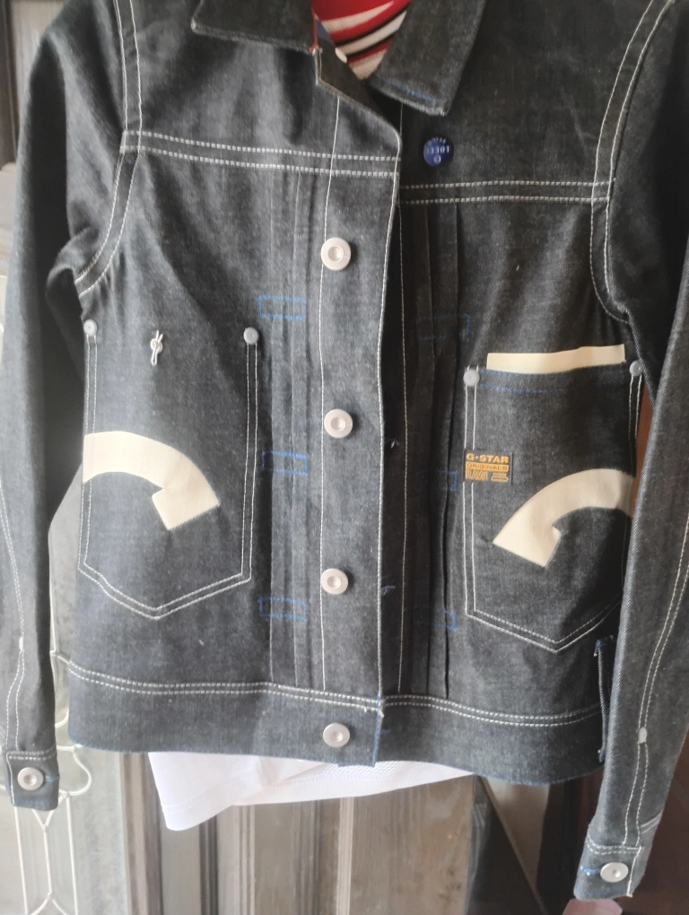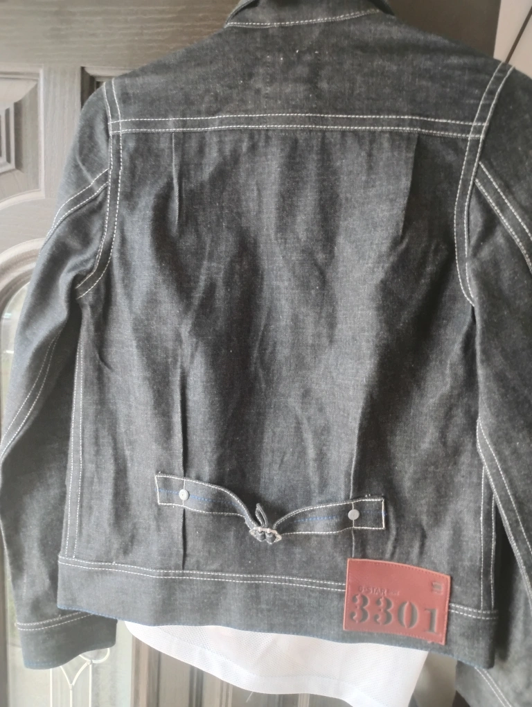 Selling a G-Star RAW 3301 denim jacket. It's in great condition and has a unique design with contrasting stitching and the iconic G-Star logo on the pocket. Perfect for adding a stylish touch to any outfit!