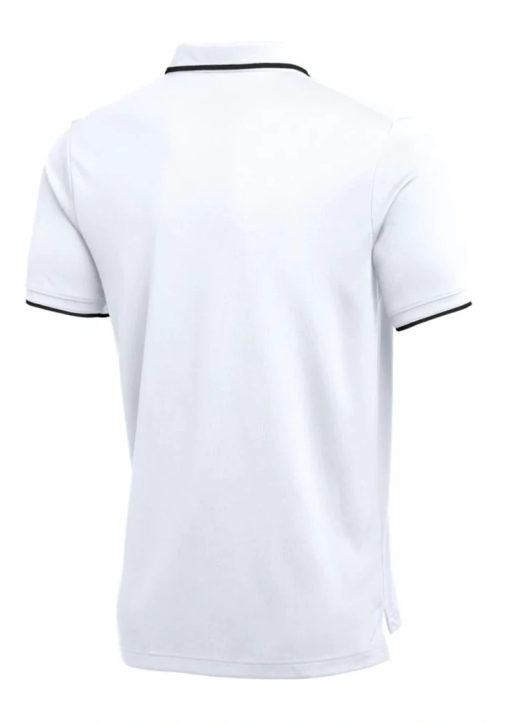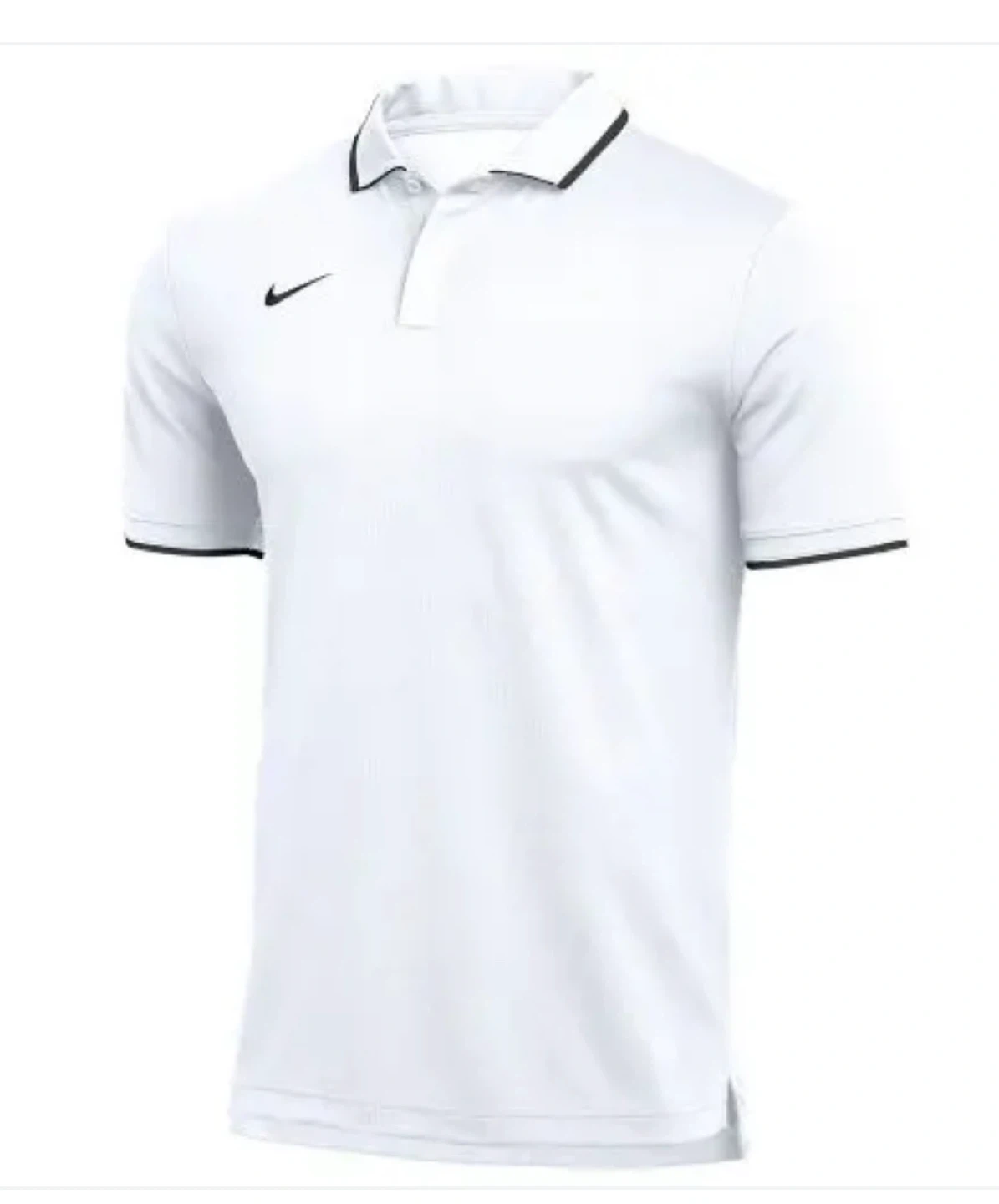 Here's a clean white Nike polo shirt! It's a classic look that's great for casual wear or even a round of golf. The shirt features a simple design with a black Nike swoosh logo. It's in good condition and ready for a new home