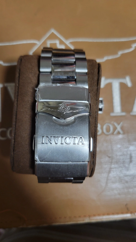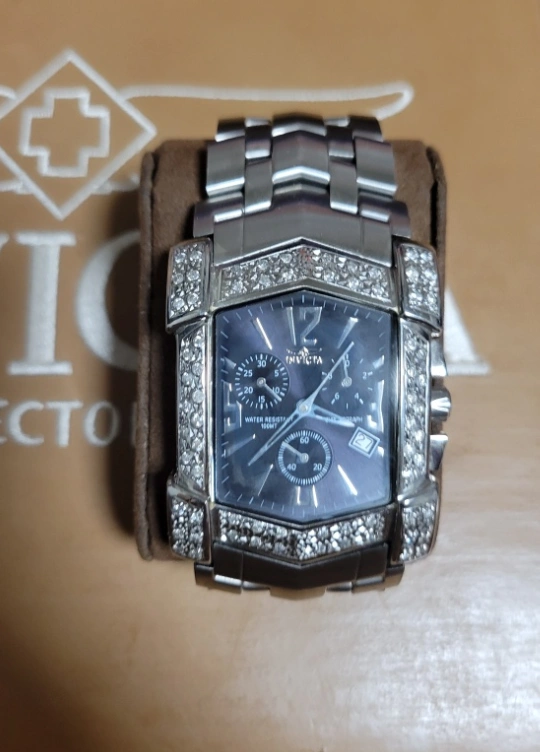 Selling a men's Invicta watch. It's a stainless steel watch with a blue face and decorative stones. It's in good condition and ready for a new owner