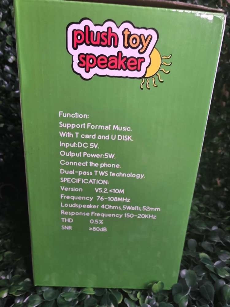 193Selling a cute plush toy speaker with a bear design! It supports various music formats with a T card and U Disk. It connects to your phone and has dual-pass TWS technology. Specifications: - Version: V5.2 ≤10M - Frequency: 76-108MHz - Loudspeaker: 4Ohms, 5Watts, 52mm - Response Frequency: 150-20KHz - THD: 0.5% - SNR: ≥80db Best way to get a deal is if you make multiple offers on different items. I got lots of stuff for sale.