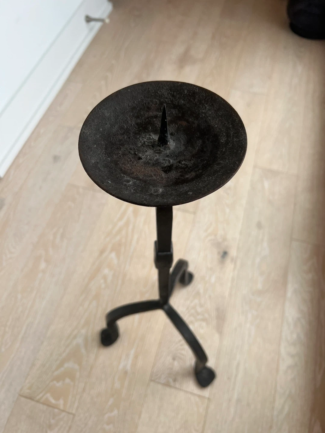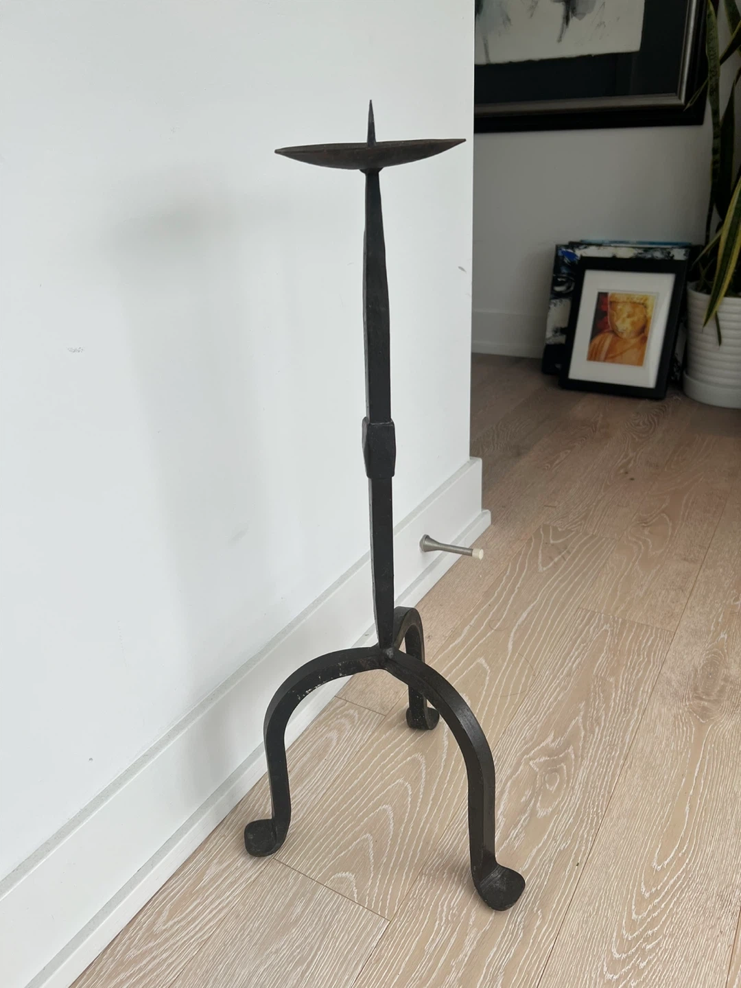 Selling a unique rod iron candlestick holder. It has a rustic, antique look and would be a great addition to any room. The holder is sturdy and well-made, with a three-legged base for stability