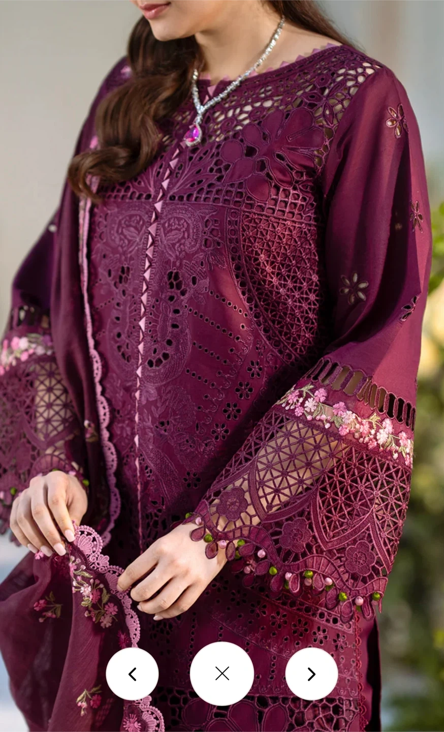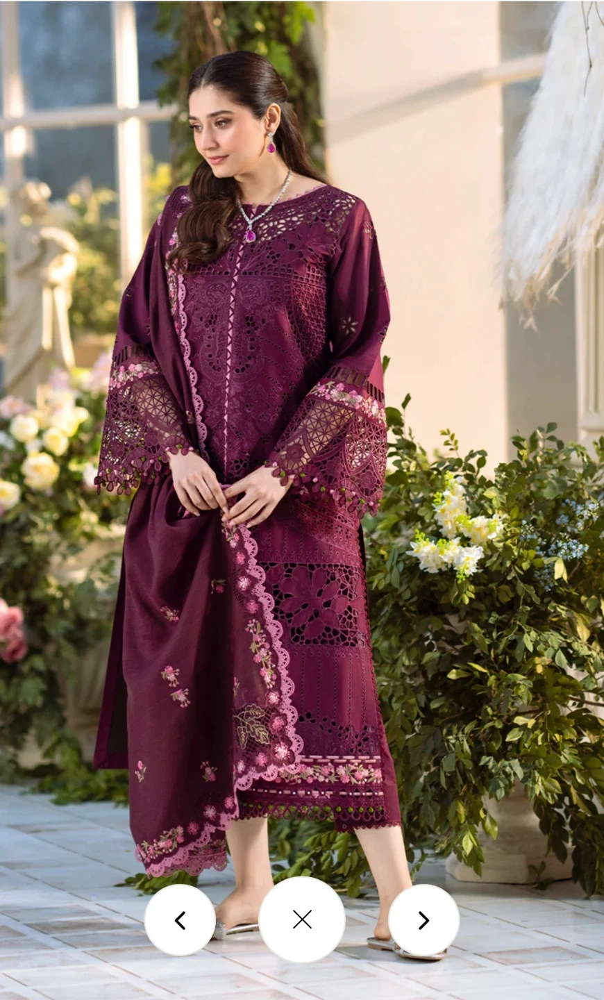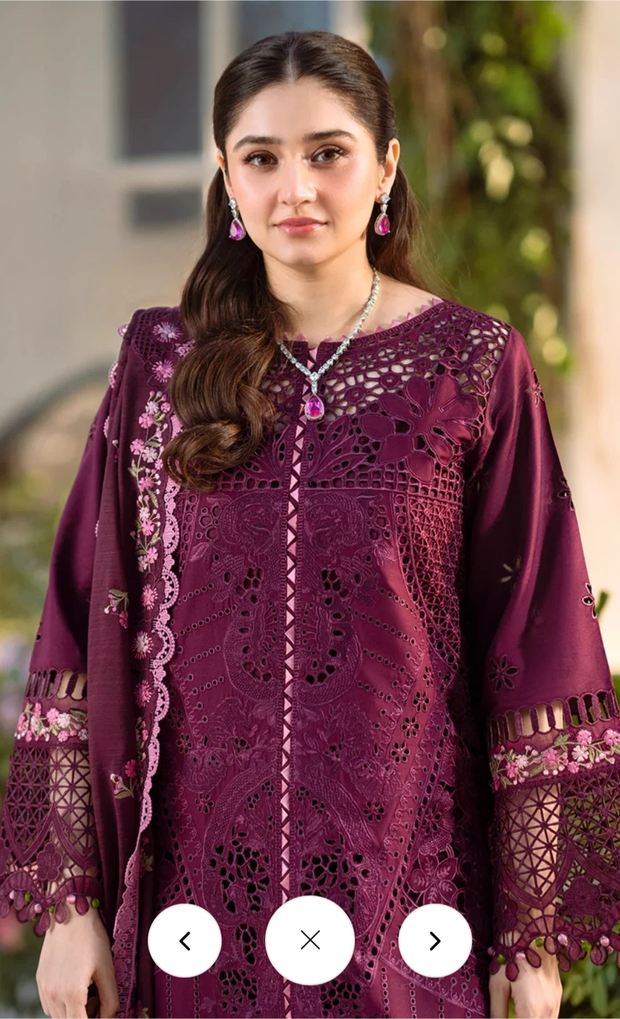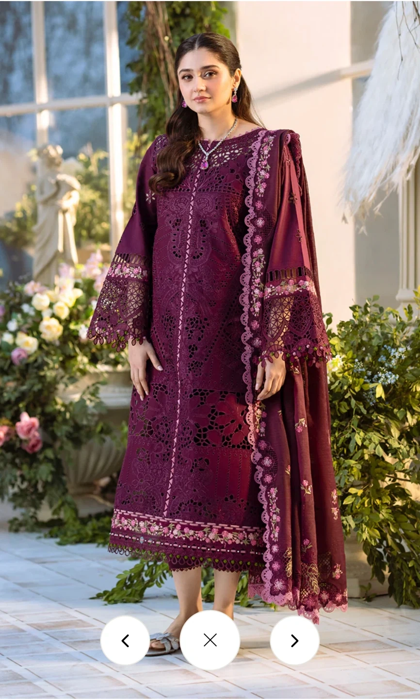 Beautiful maroon three-piece suit with intricate embroidery detailing. This elegant outfit is perfect for special occasions or festive gatherings. The set includes a stylishly designed shirt, matching trousers, and a complementary dupatta to complete the look. It's in great condition and ready for a new home! Fabric cotton Lawn