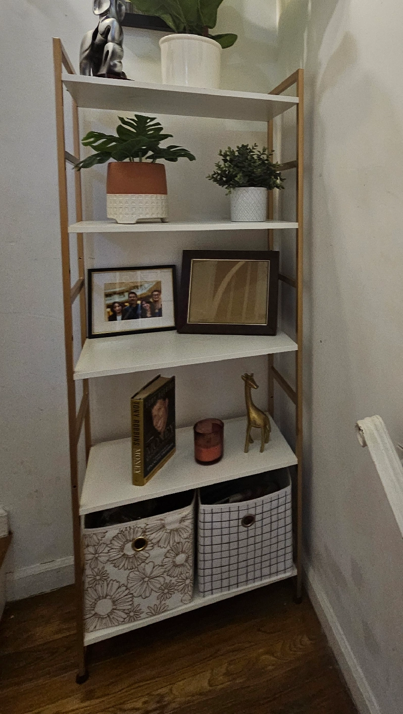 Selling a stylish 5-tier bookshelf with a white and gold finish. It's perfect for displaying books, plants, or decorative items. This bookshelf is in great condition and ready to add some flair to your space!