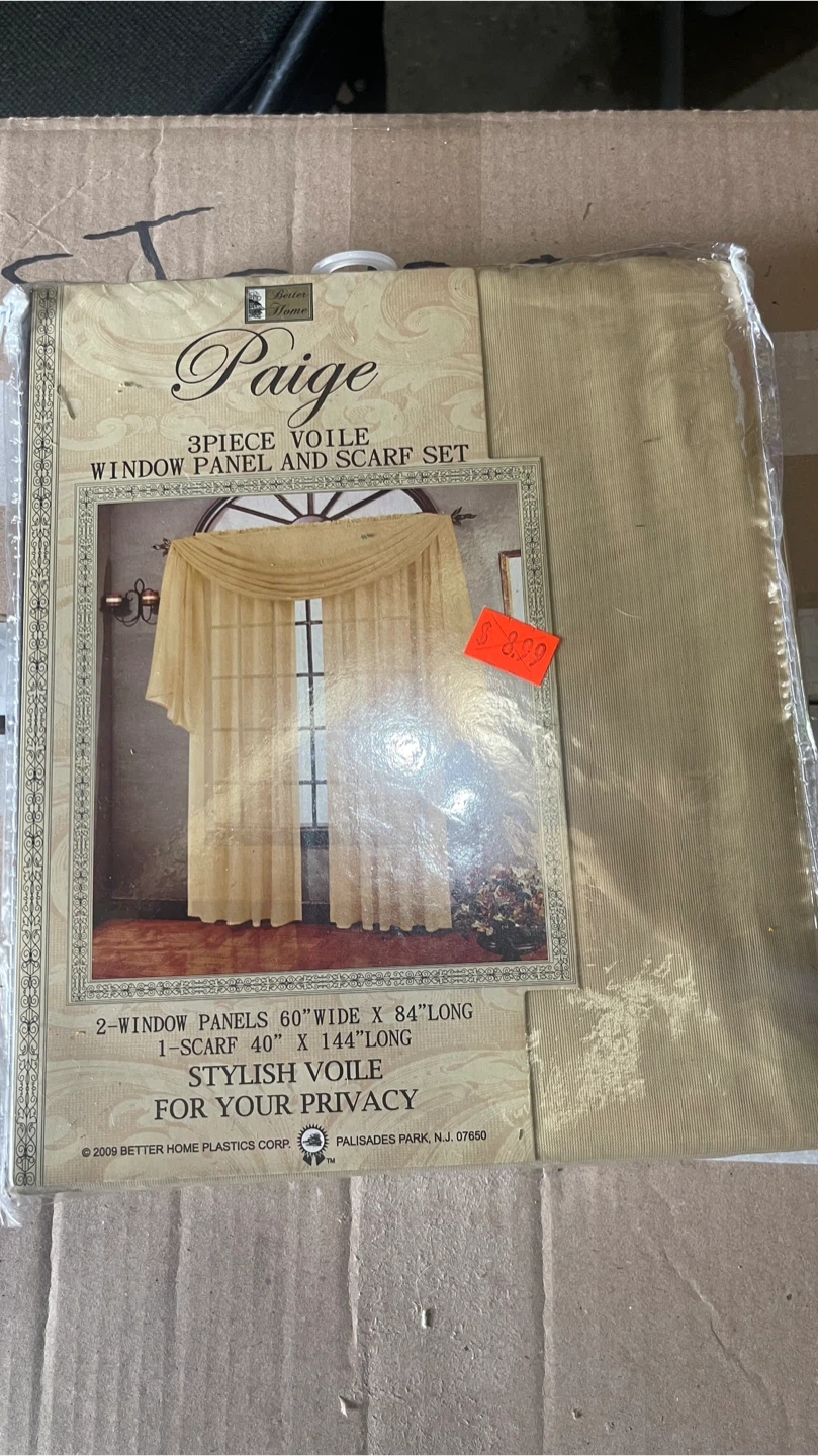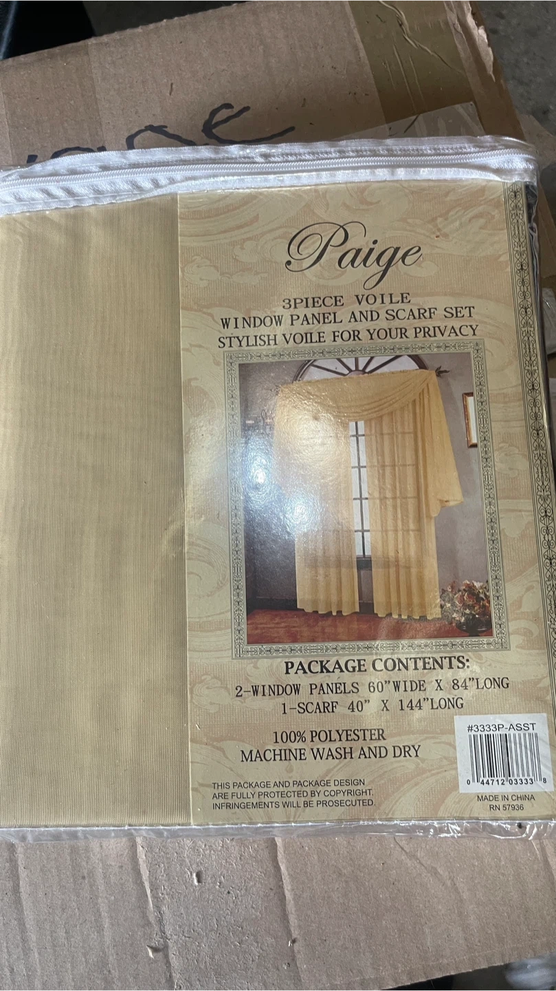 Selling a Paige 3-piece voile window panel and scarf set. It includes two window panels (60" wide x 84" long) and one scarf (40" x 144" long). The material is 100% polyester and is machine washable and dryable