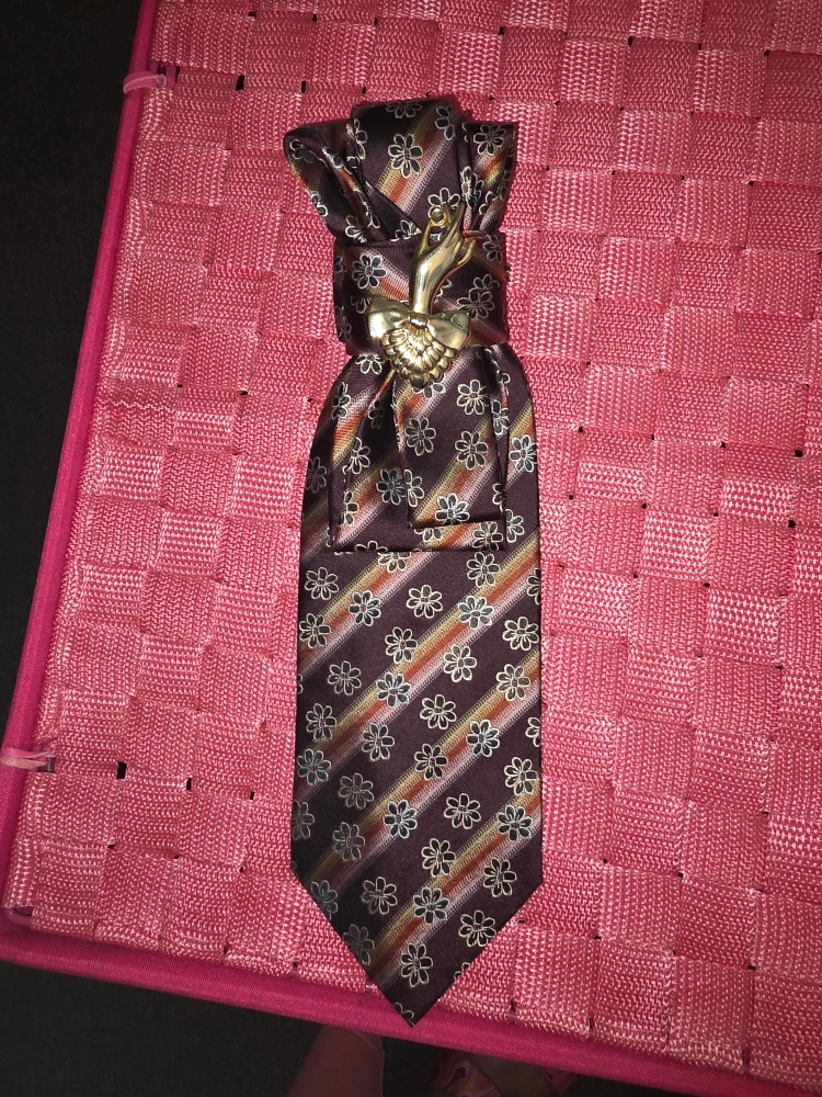 This is a stylish tie with a unique flower pattern and a decorative pin. It's in good condition and ready to add a touch of flair to your wardrobe