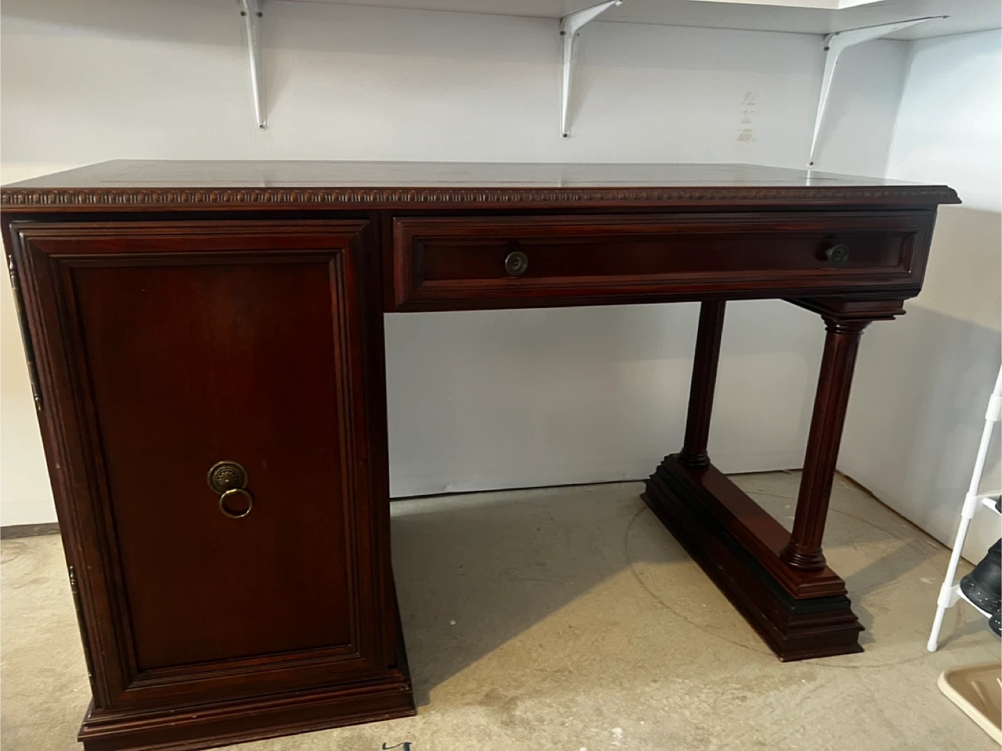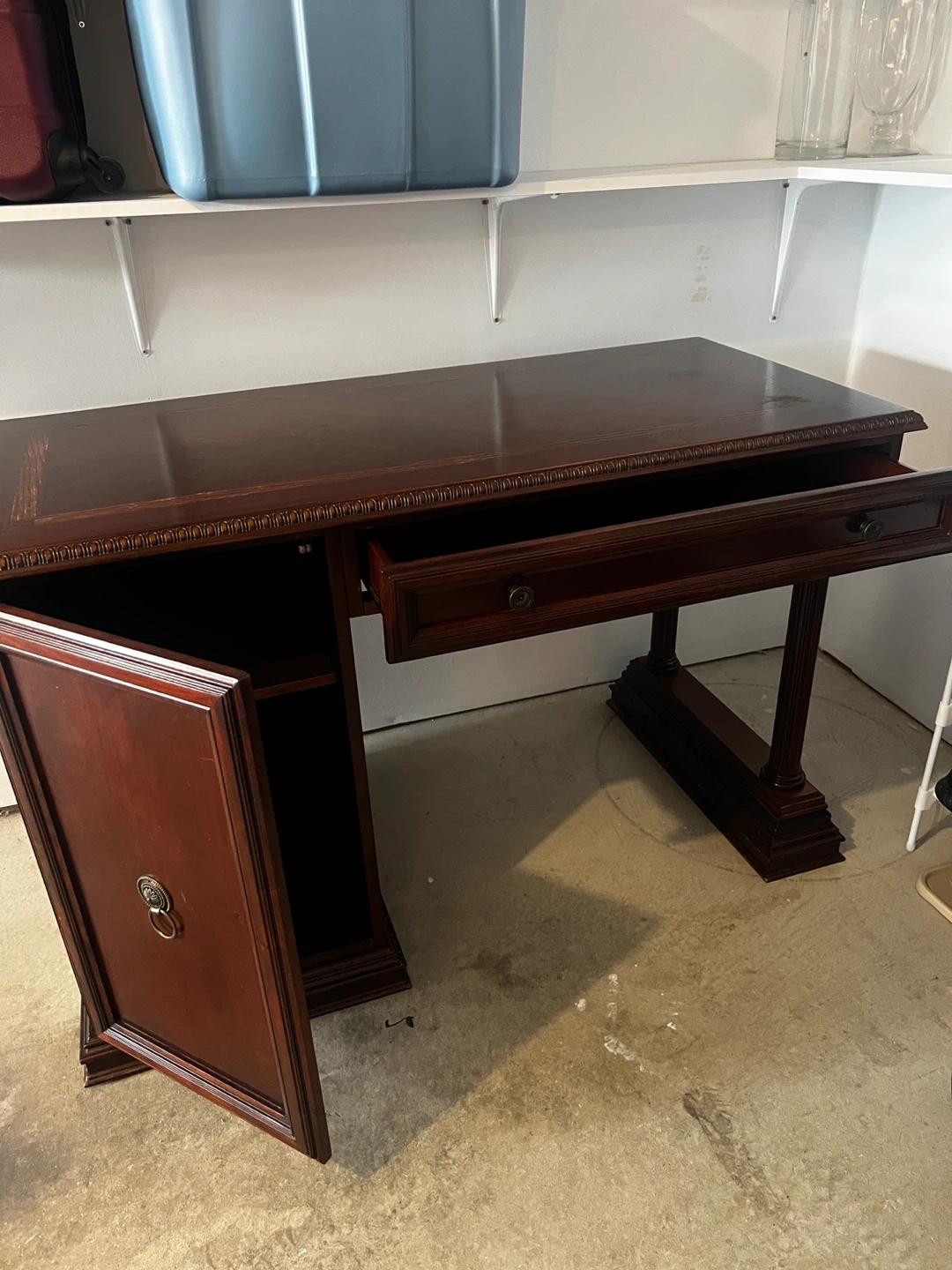 Due to downsizing, selling a lovely wooden desk, perfect for a home office or study space! It features a spacious drawer and a cabinet for storage. The desk is in good condition and has a classic design that would fit well with many styles. Price to reflect quick sale