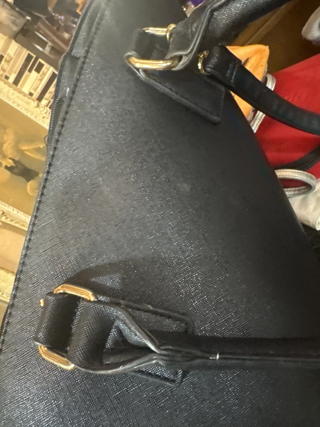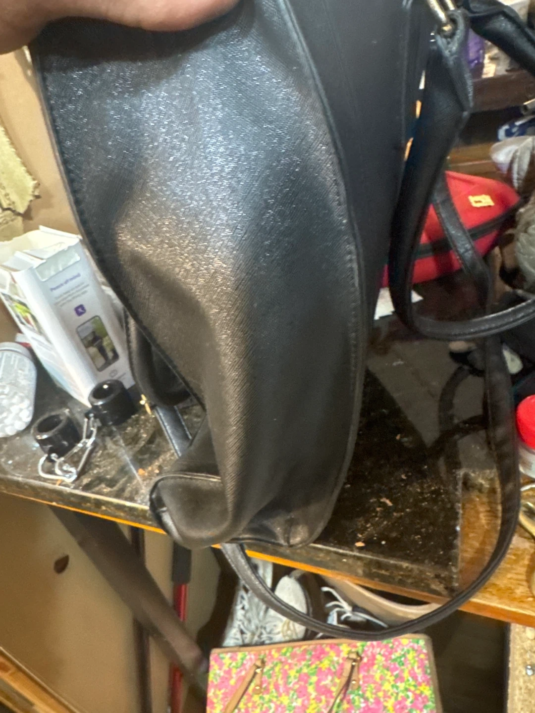 This black tote handbag features a faux leather exterior and a star-patterned interior lining. It has an interior zip pocket and multiple slip pockets. The bag is a good size for everyday essentials. Gold-tone hardware. Tote style with double handles.