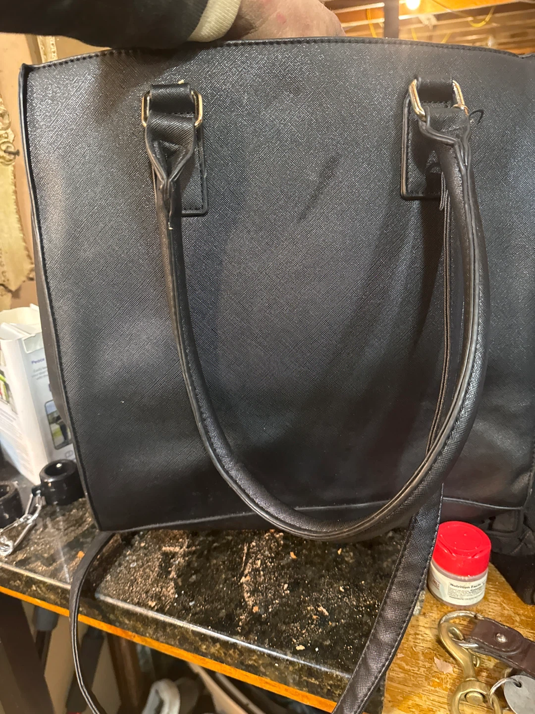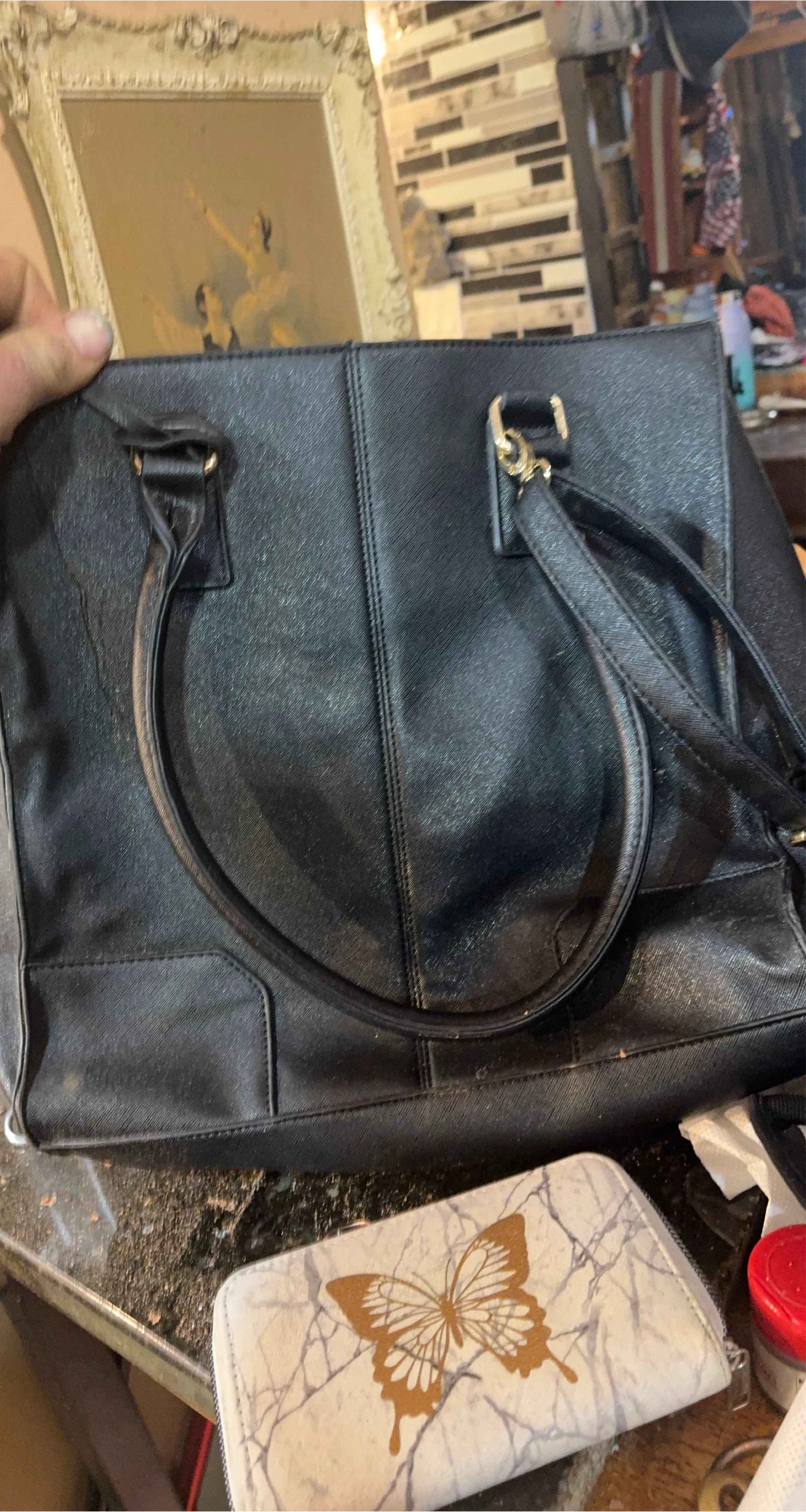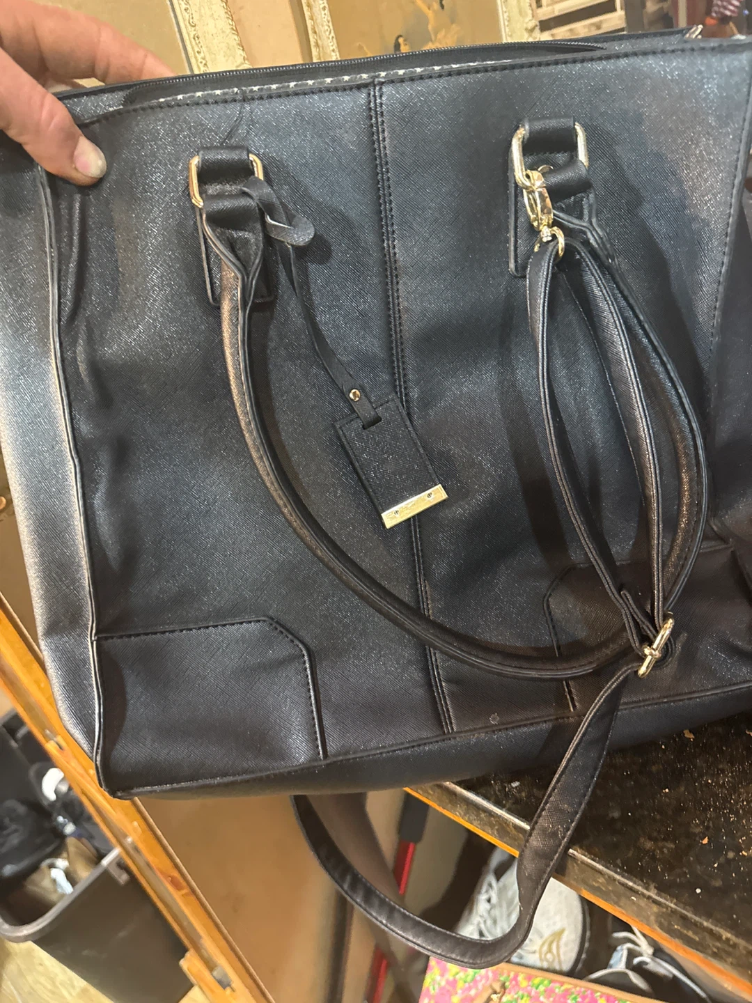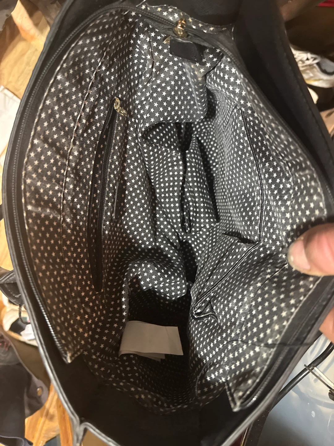 This black tote handbag features a faux leather exterior and a star-patterned interior lining. It has an interior zip pocket and multiple slip pockets. The bag is a good size for everyday essentials. Gold-tone hardware. Tote style with double handles.