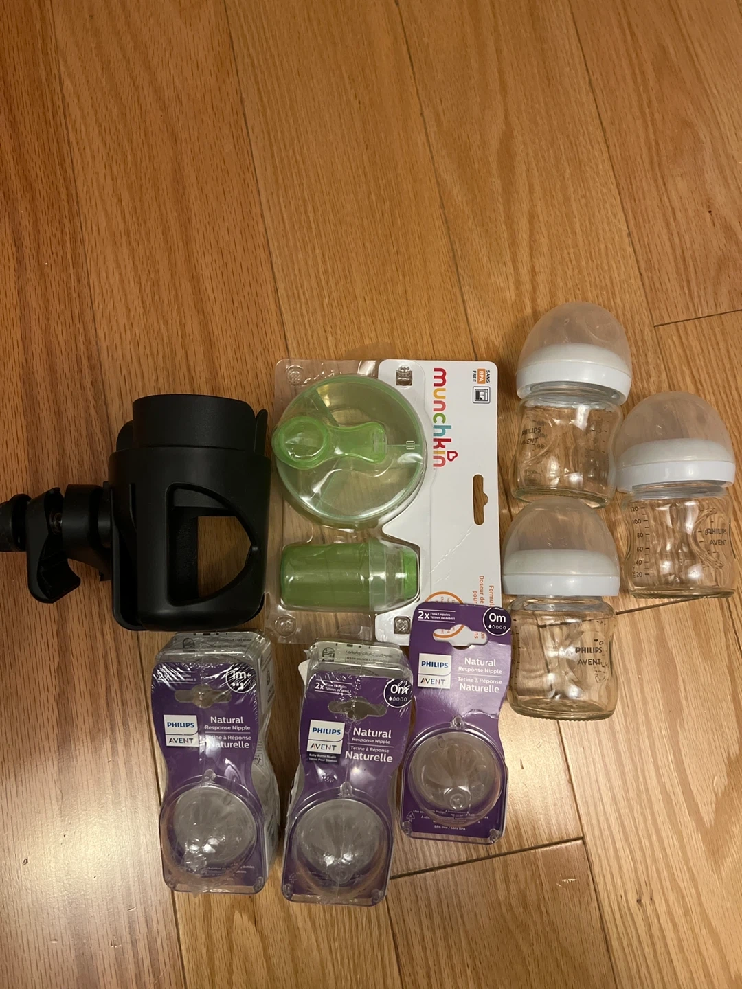 84Selling a set of Philips Avent bottles and a Munchkin formula dispenser. The Philips Avent nipples are still in their original packaging and are for 0m+. The bottles are glass. Bottles and stroller holder has been used.