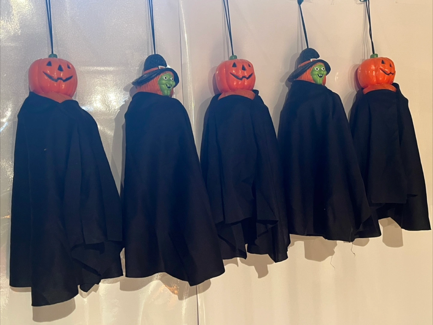 Cute Halloween decorations featuring a pumpkin head and witch figure with a black cloak. Perfect for adding a spooky touch to your home this Halloween season!
