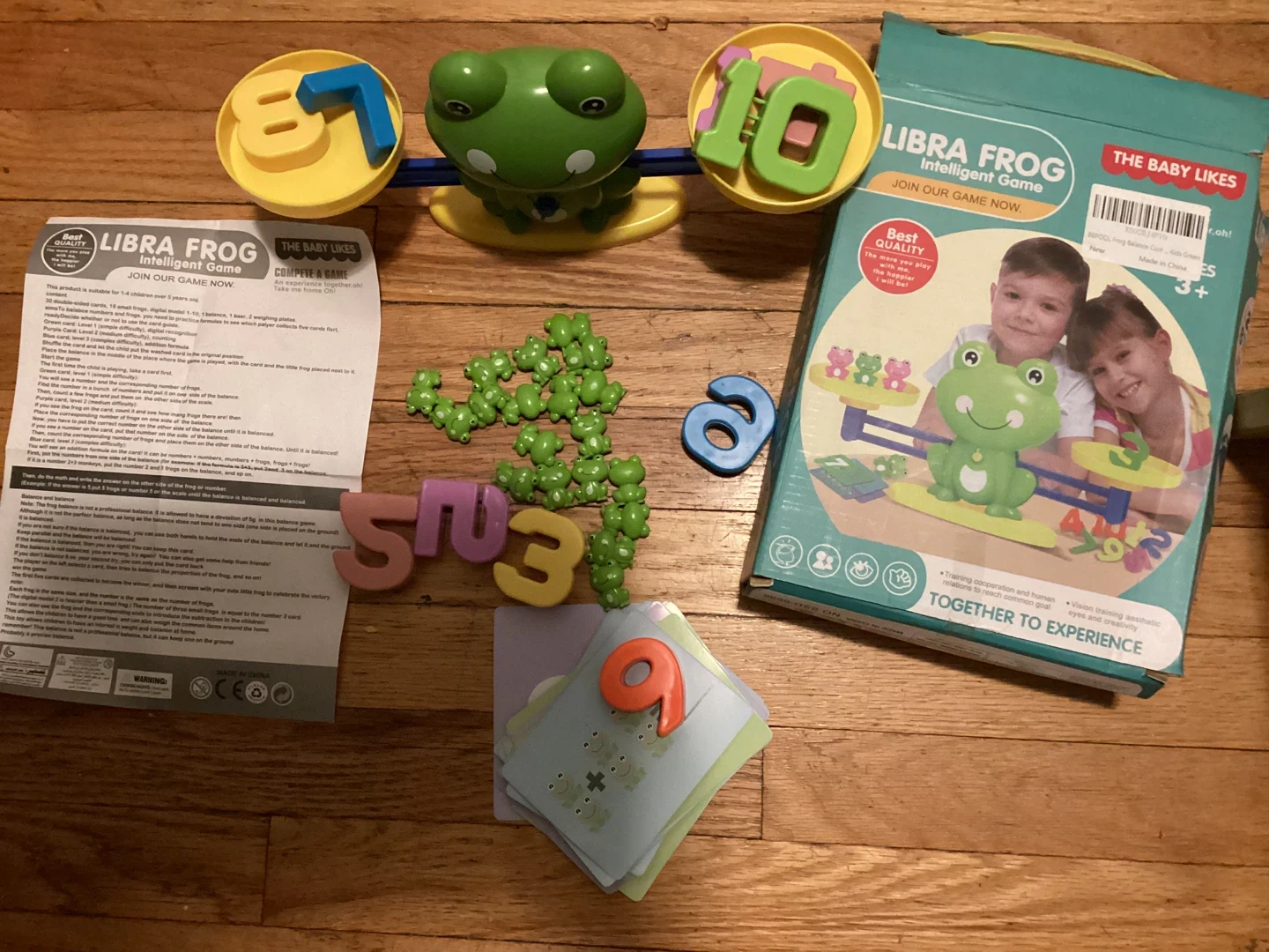 370Selling a Libra Frog Intelligent Game! It's a fun way for kids to learn numbers and balancing. The set includes small frogs, digital model 1-10, balance, and weighting plates. It's suitable for children ages 3 and up. The box is included!