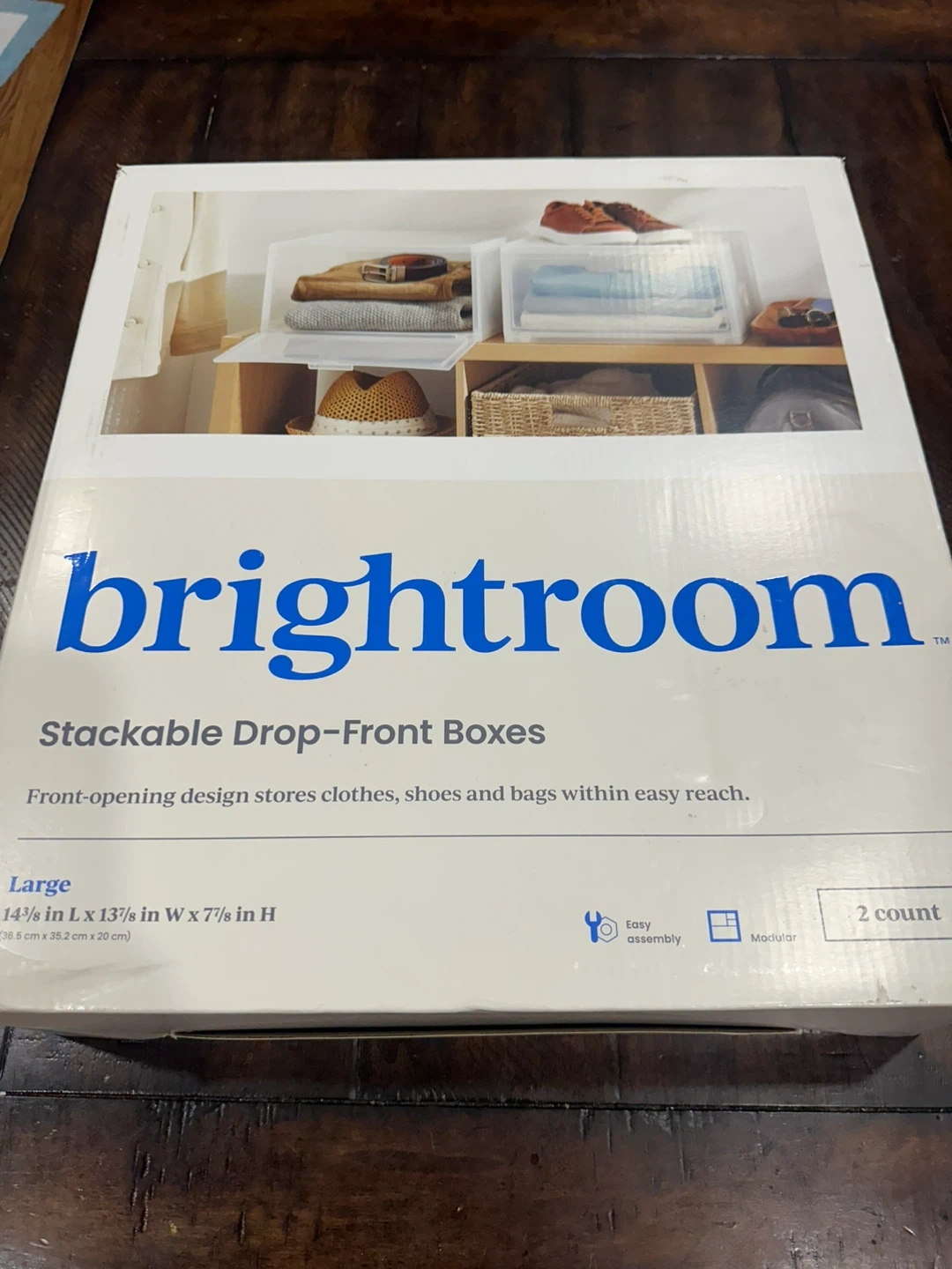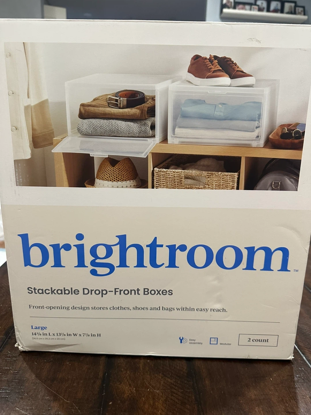 Selling a set of Brightroom Stackable Drop-Front Boxes! These are great for organizing clothes, shoes, and bags. The boxes are large, measuring 14 3/8 inches in length, 13 7/8 inches in width, and 7 7/8 inches in height. Easy to assemble and modular!