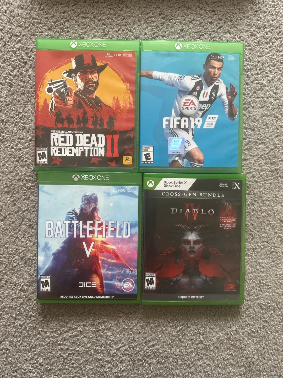 Selling my Xbox One S Military Green edition with games and three controllers. The games included are Red Dead Redemption II, FIFA 19, Battlefield V, and Diablo. Don’t have time to play anymore and want to let it go to someone who wants to play.