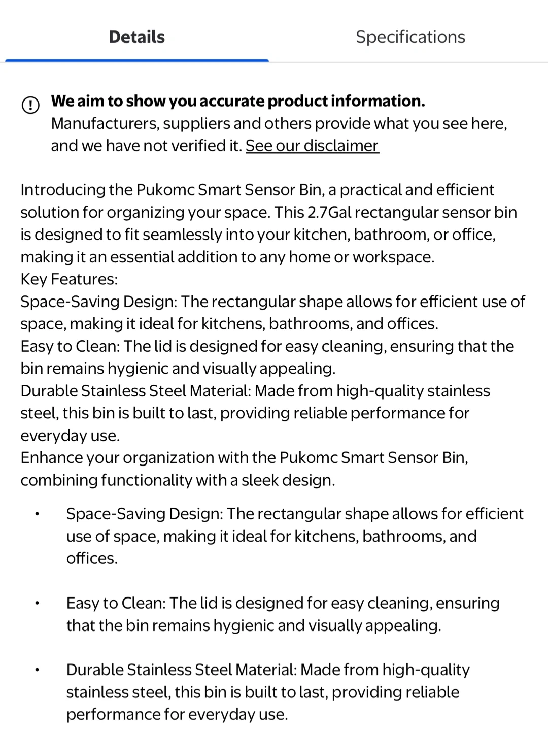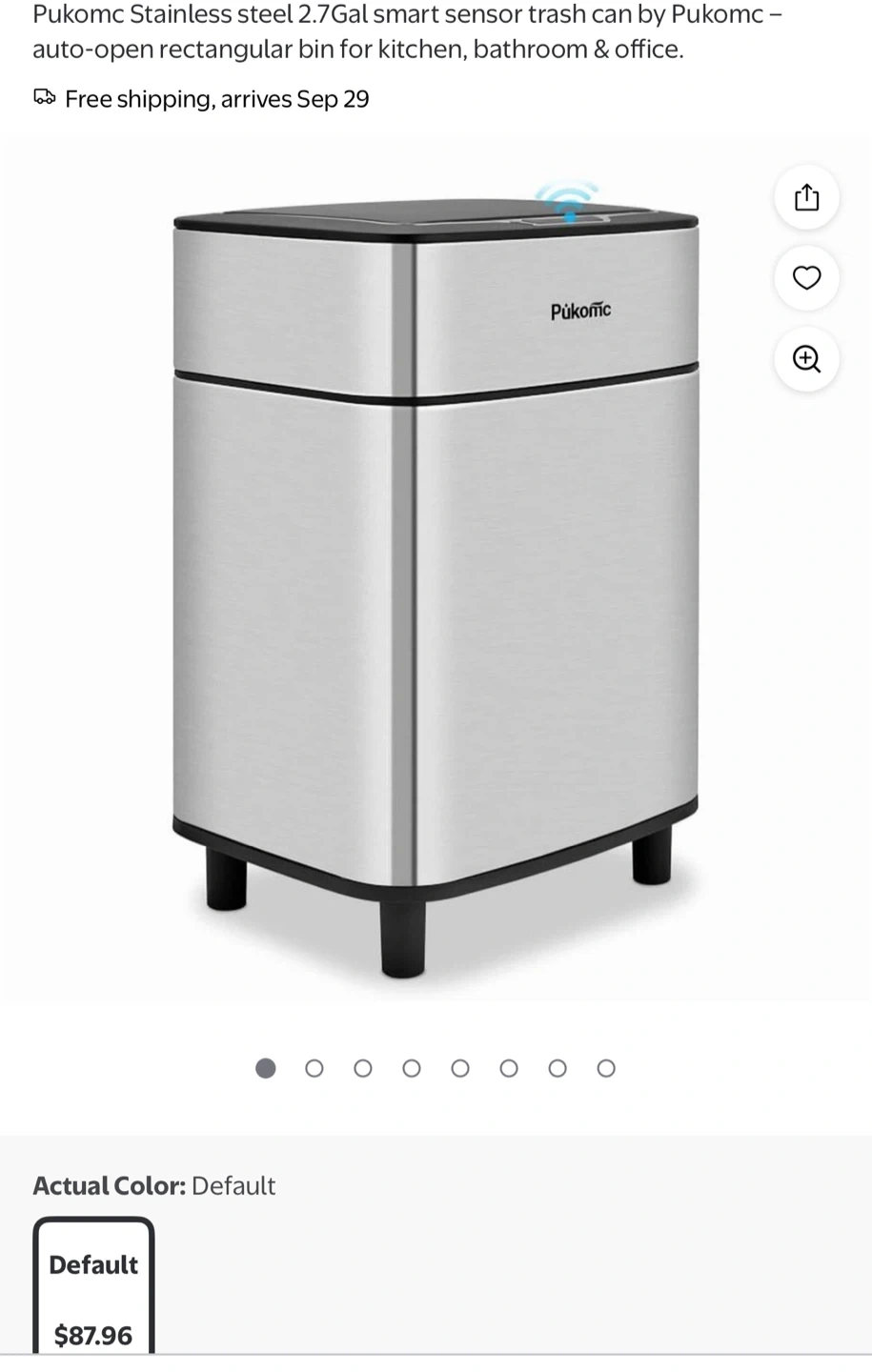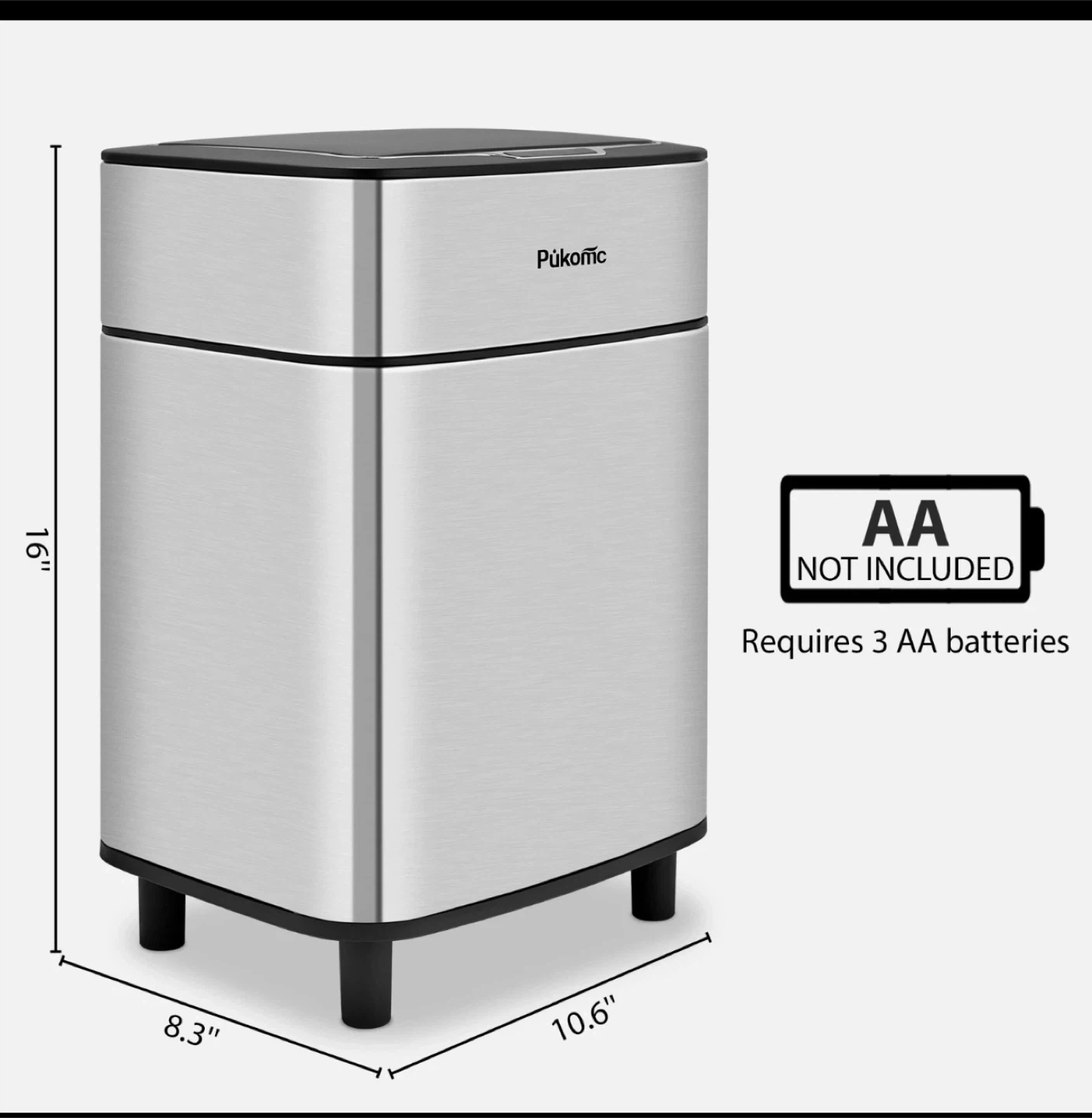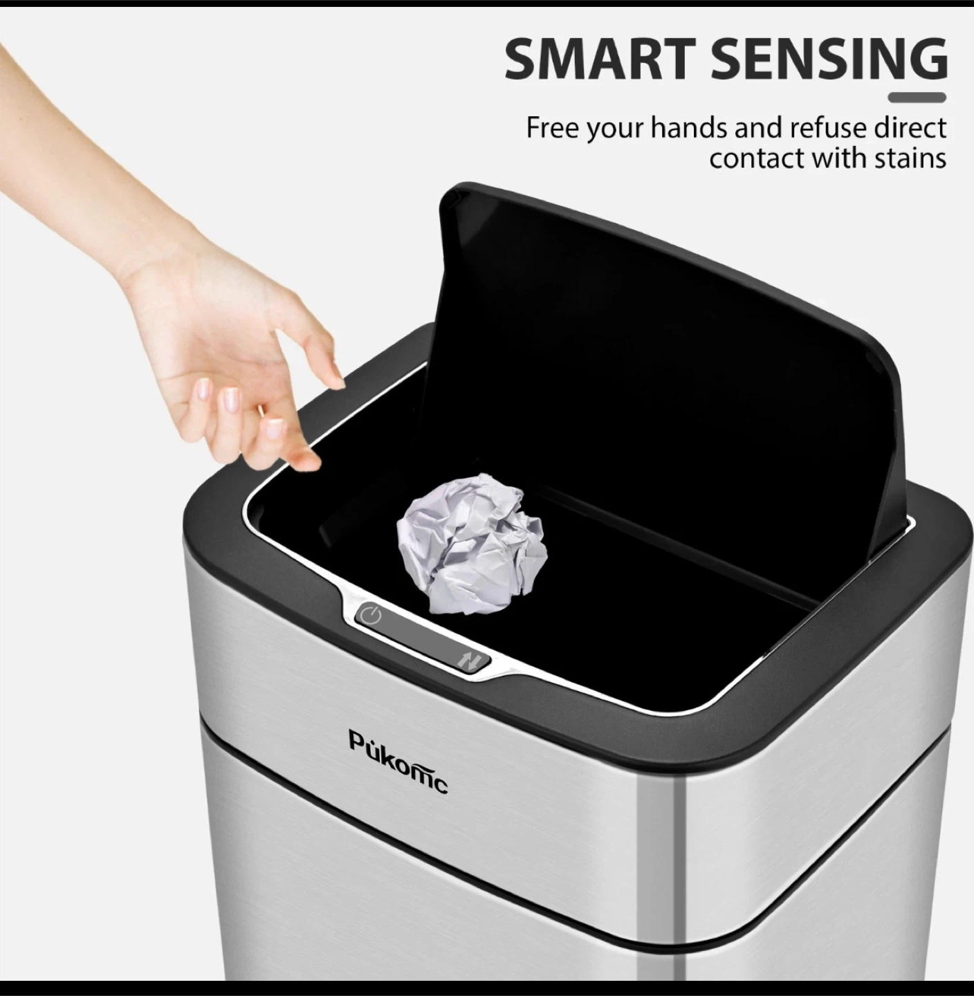 Selling a Pukomc stainless steel 2.7 Gal smart sensor trash can. It's an auto-open rectangular bin perfect for the kitchen, bathroom, or office. The lid will remain open for 5 seconds to ensure that users have enough time to dispose of garbage. It's designed for smart sensing, freeing your hands and refusing direct contact with stains. Originally bought for $87.96