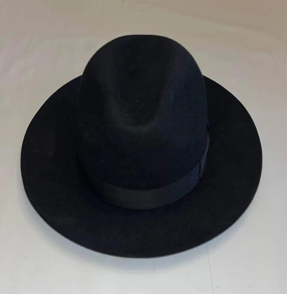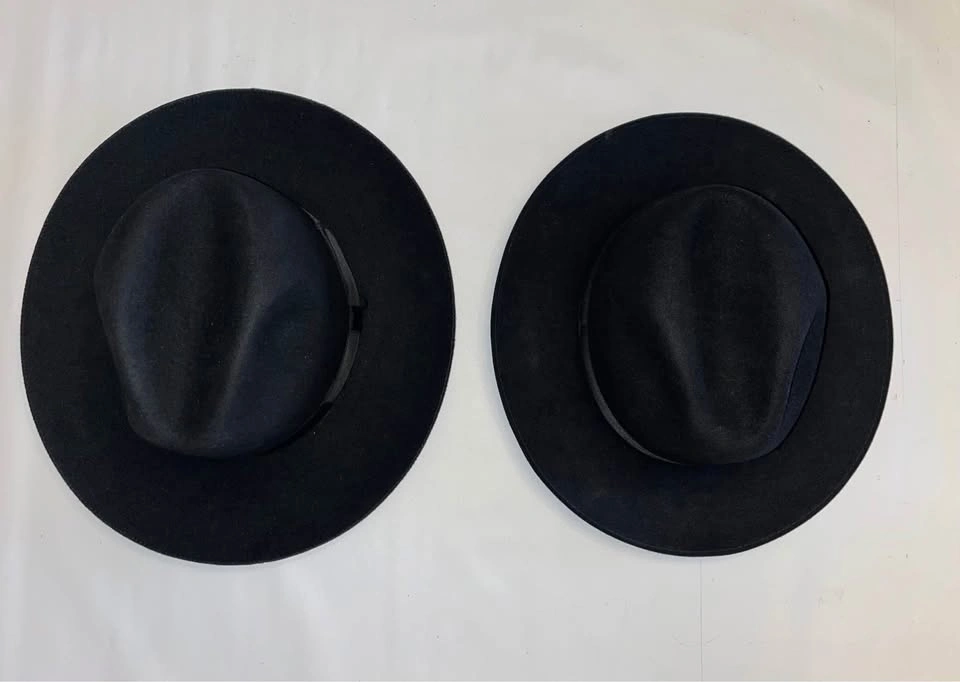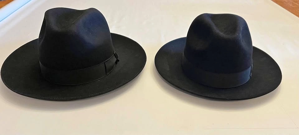 This is for a pair of men’s black fedoras from the Hat Box store. One is a Cervo Elite size 7 made in Hungary with 100 percent rabbit fur felt. The other is by Lusso size 7 1/8 made with pure fur felt. Both hats are slightly used and are in great condition. They both come with a free Hat Box travel box. One of the boxes isn’t working 100 percent since it’s missing a piece.