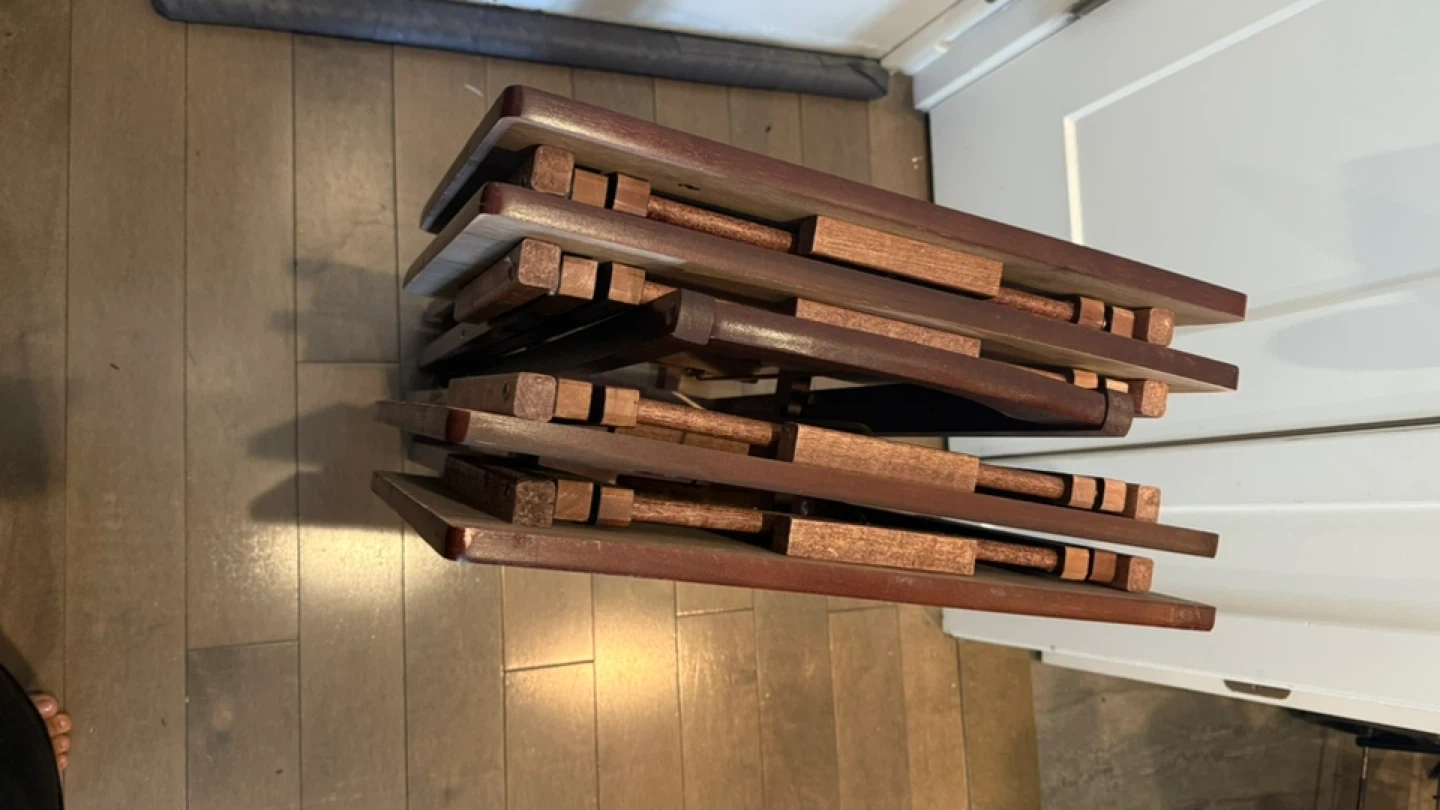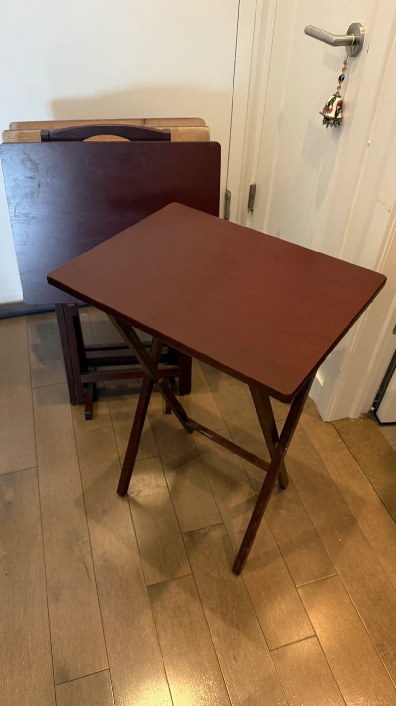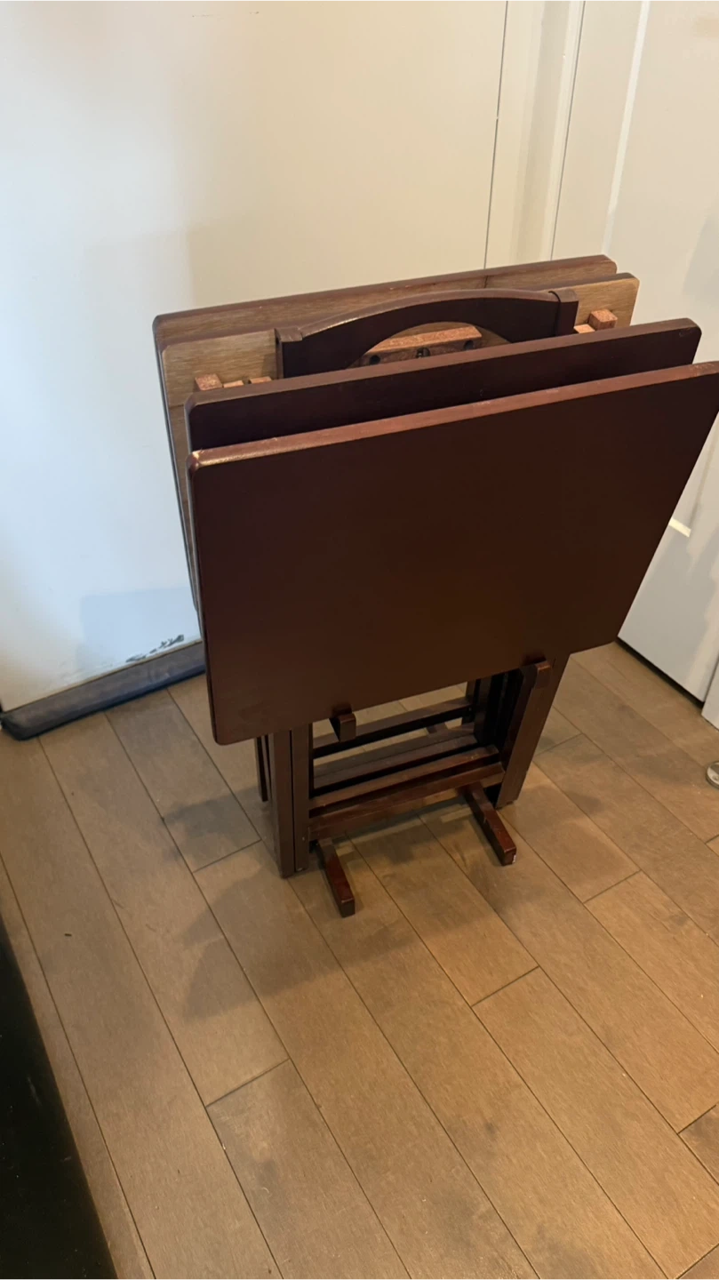 Selling a set of four wooden TV tray tables! These are perfect for enjoying a meal in front of the TV or for extra surface space when you have guests. They are in good condition and ready for a new home!