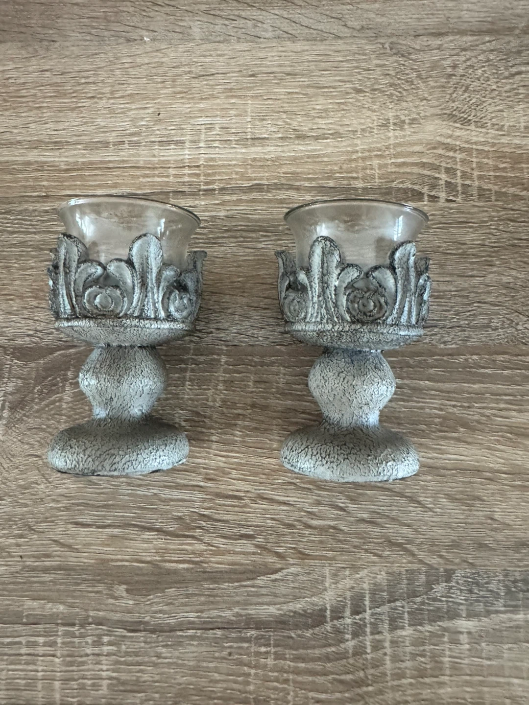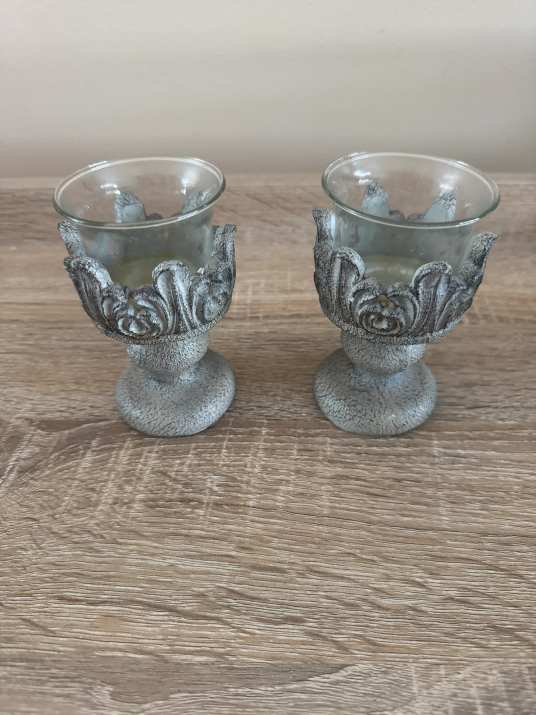 Selling a pair of decorative candle holders. They have a unique design with a glass insert and a textured, gray base. Perfect for adding a touch of elegance to any room!