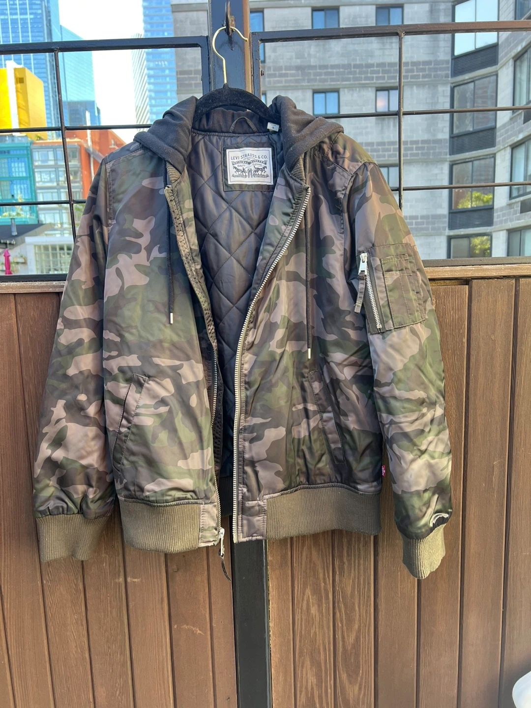 Selling a Levi Strauss & Co. camo jacket in size L. The jacket features a unique camouflage pattern and is made of 100% polyester. It has a hood and a zipper. Perfect for casual wear!