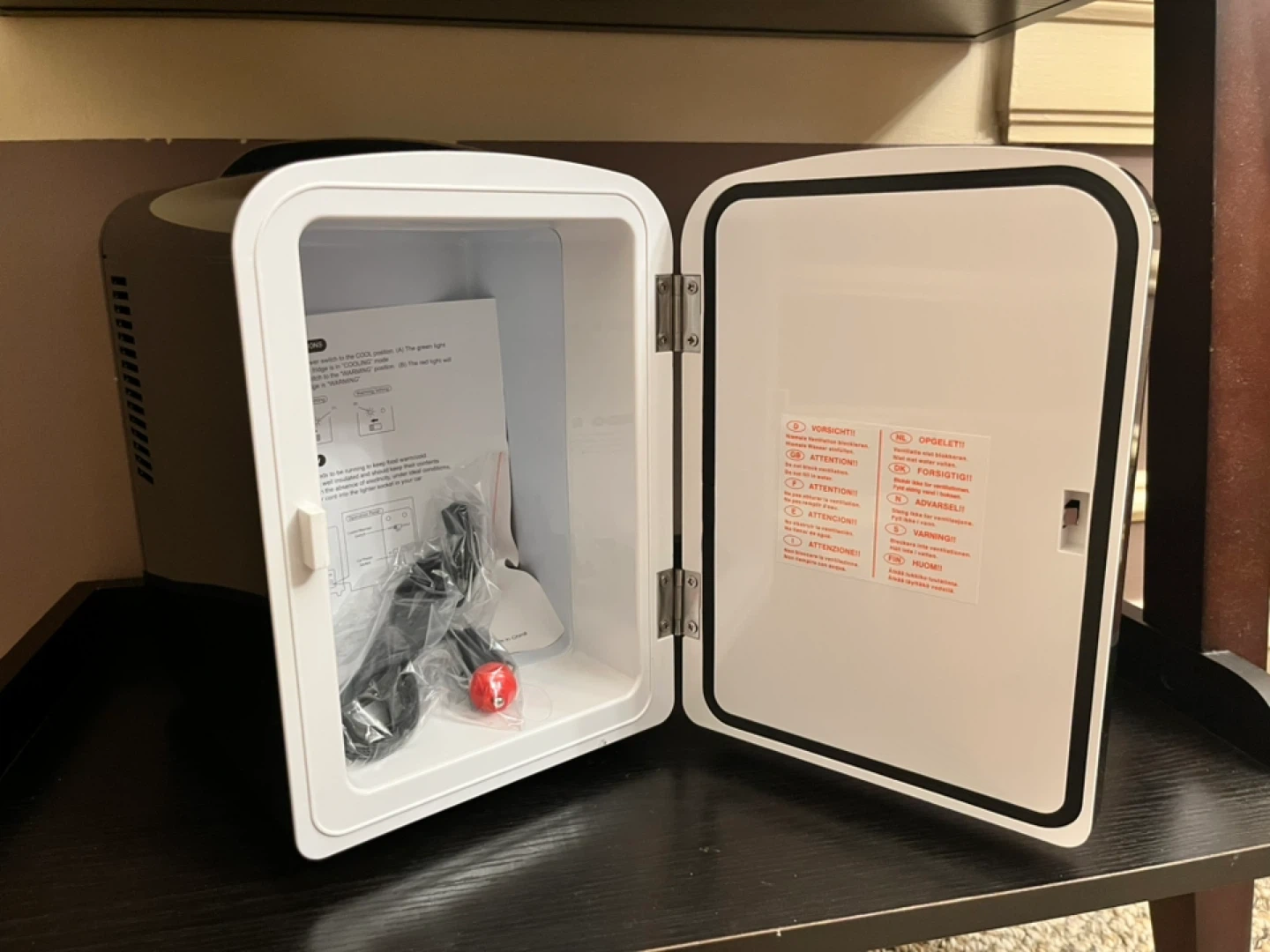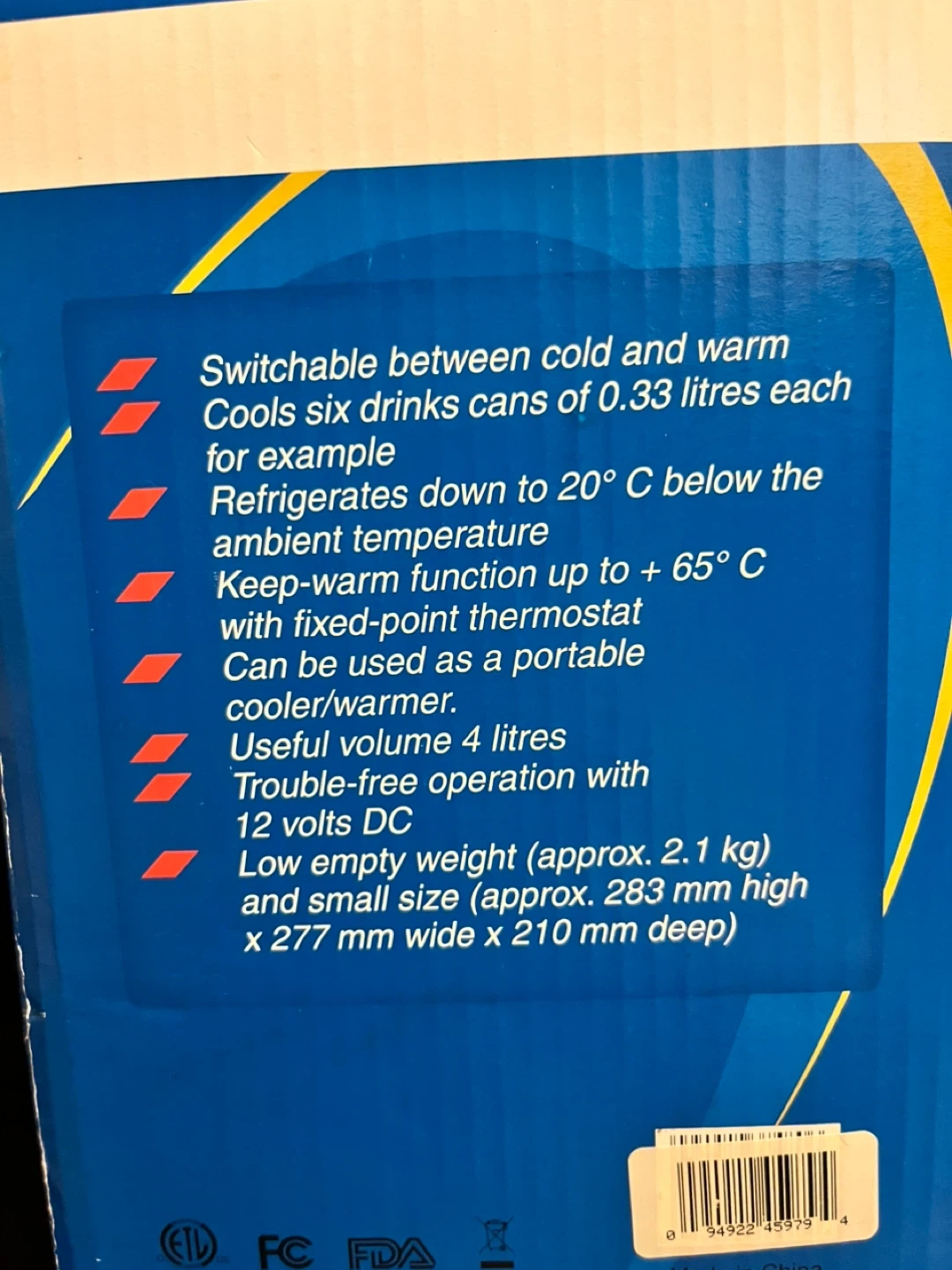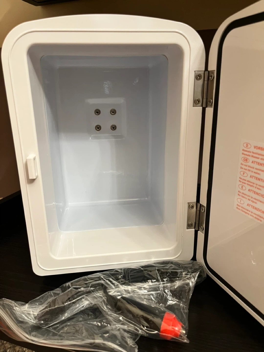 Selling a Chefman Mini Portable Personal Fridge in black. Price is firm. It's in great condition and comes with its original box and components! For use in your car, truck, SUV. Keeps cold drinks or snacks cool, and hot foods warm. It can hold up to 4L. Model number YT-A-400A.