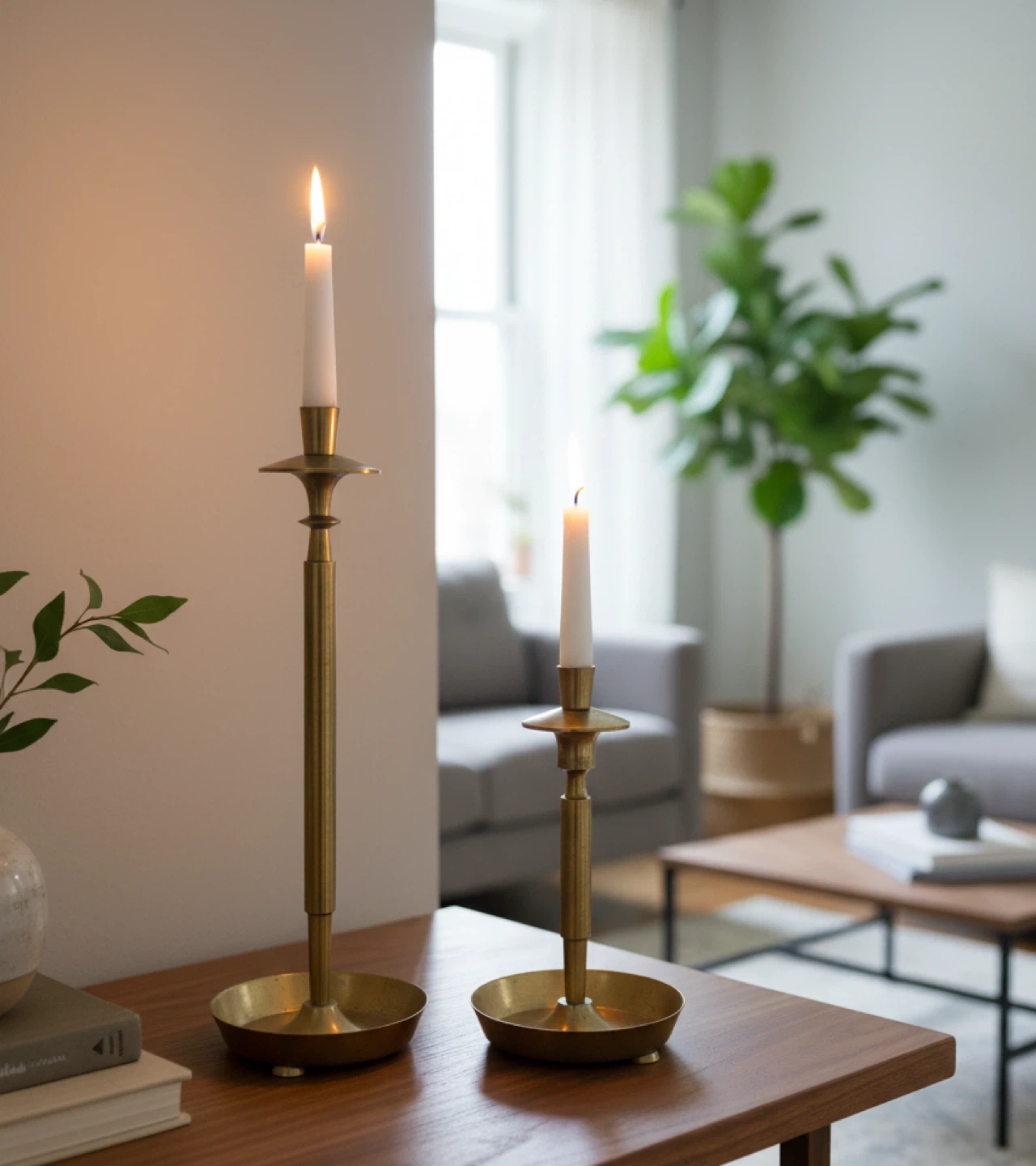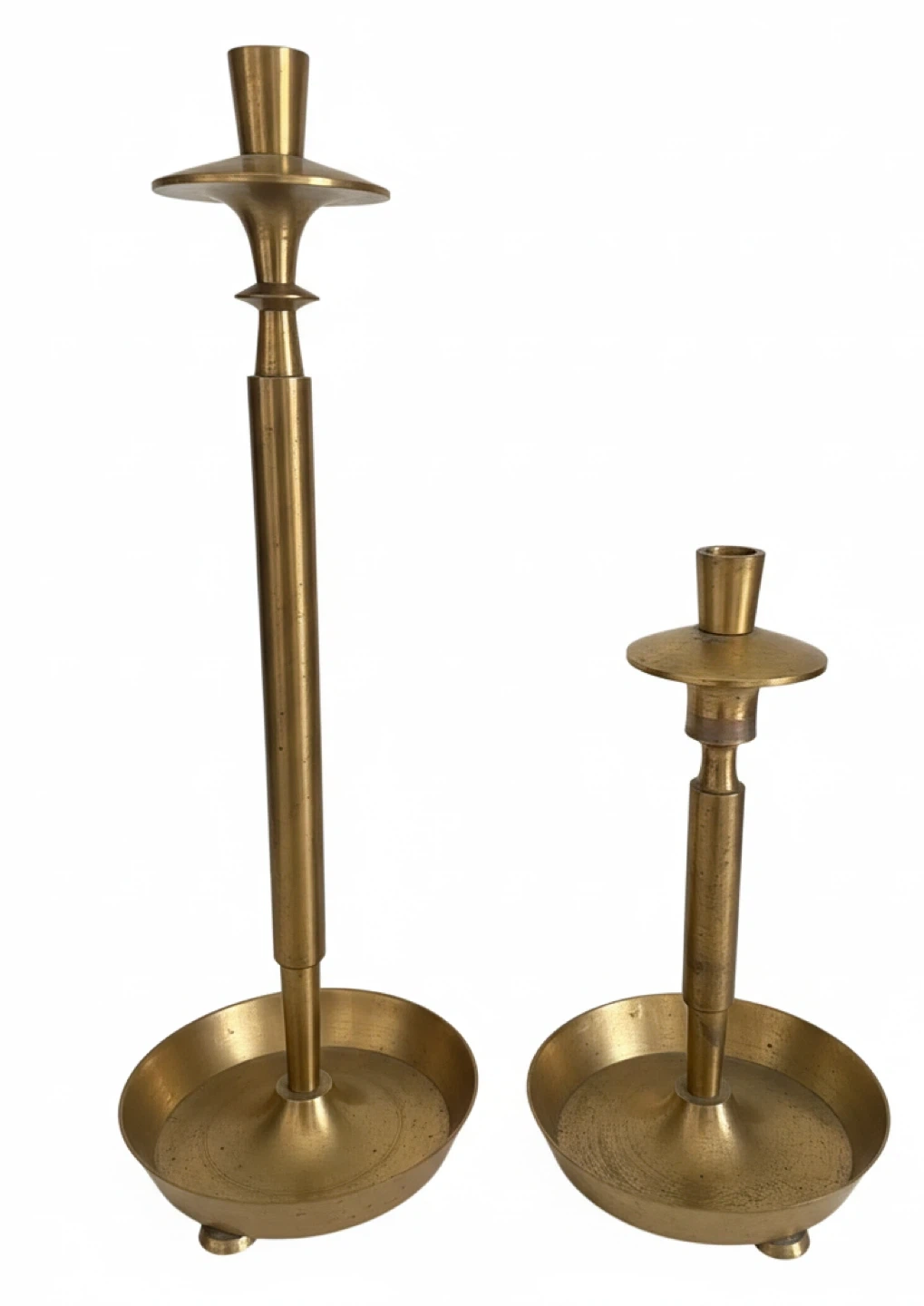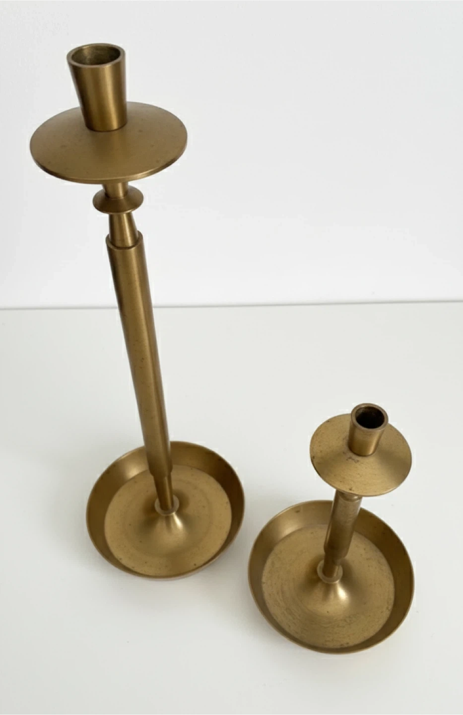 Selling a set of two vintage brass candlestick holders. They have a beautiful golden color and a classic design that would look great in any home. The set includes one taller and one shorter candlestick holder. They are in good condition and ready to add some elegance to your space! I will also add in the candles that you can put on these for free!