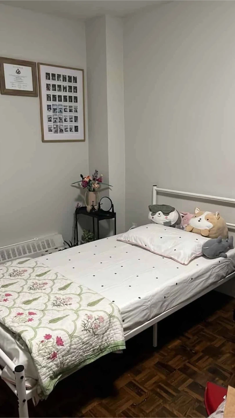 Selling a simple and sturdy white metal bed frame! It measures 75 inches in length and 38 inches in width. The height from the ground to the base is 12 inches, and the headboard is 34 inches tall. Perfect for a minimalist bedroom setup.