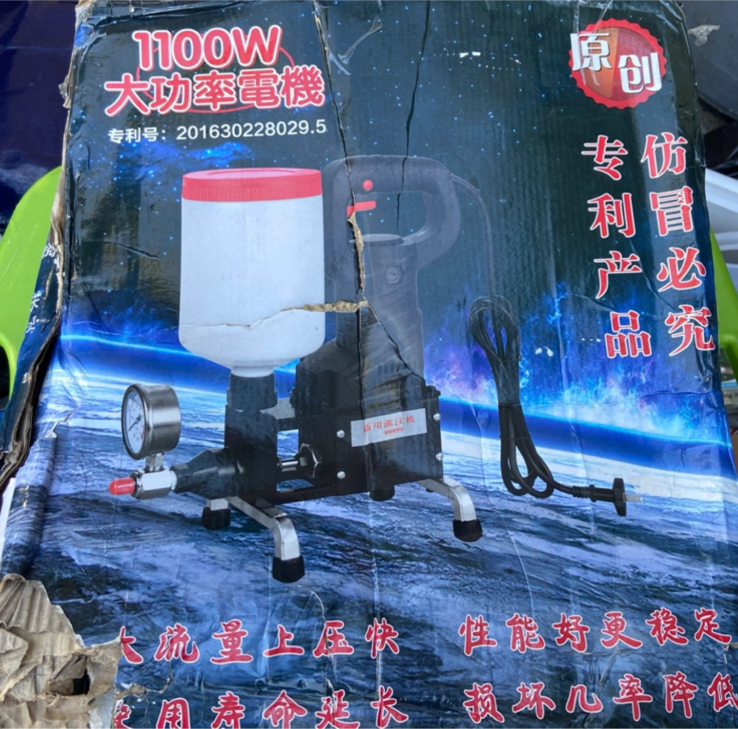 High-pressure injection grouting machine, specifically an 1100W model designed for applications like concrete crack repair and waterproofing. The box has some wear, but the machine itself is in good condition. It features a large flow rate and fast pressurization, with stable performance and a long service life.