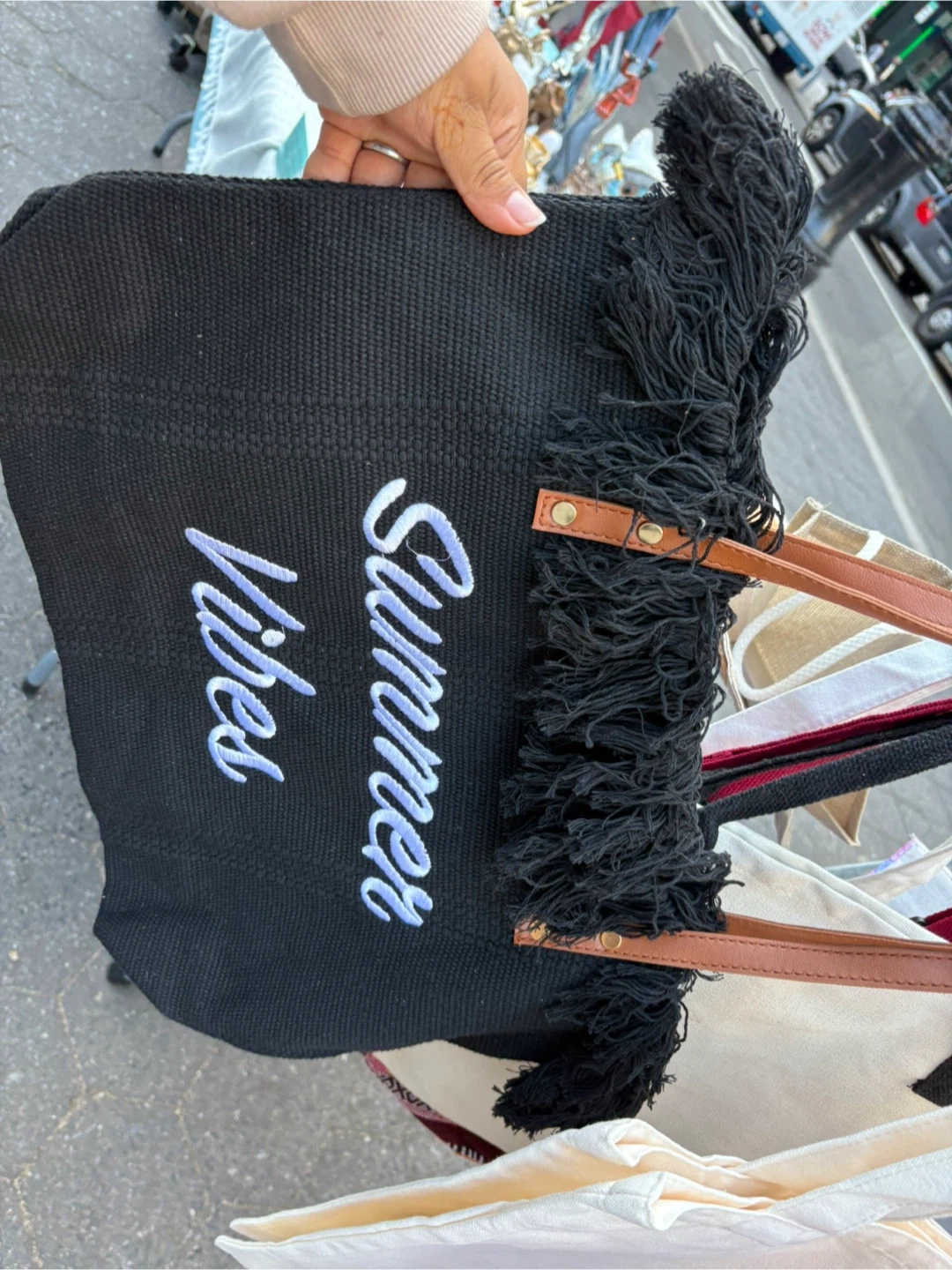 35This is a black woven tote bag with "Summer Vibes" embroidered on the side. It features a fringe detail and brown leather-like straps. Perfect for your summer adventures!