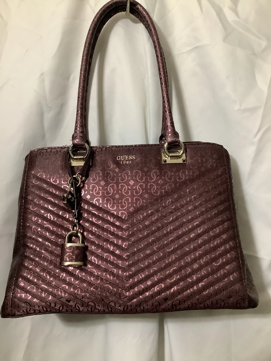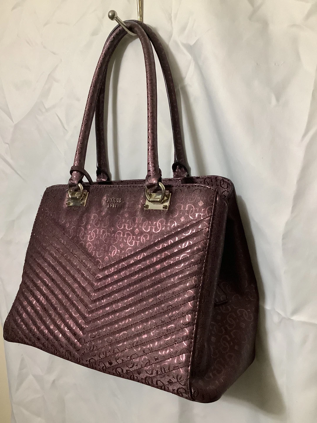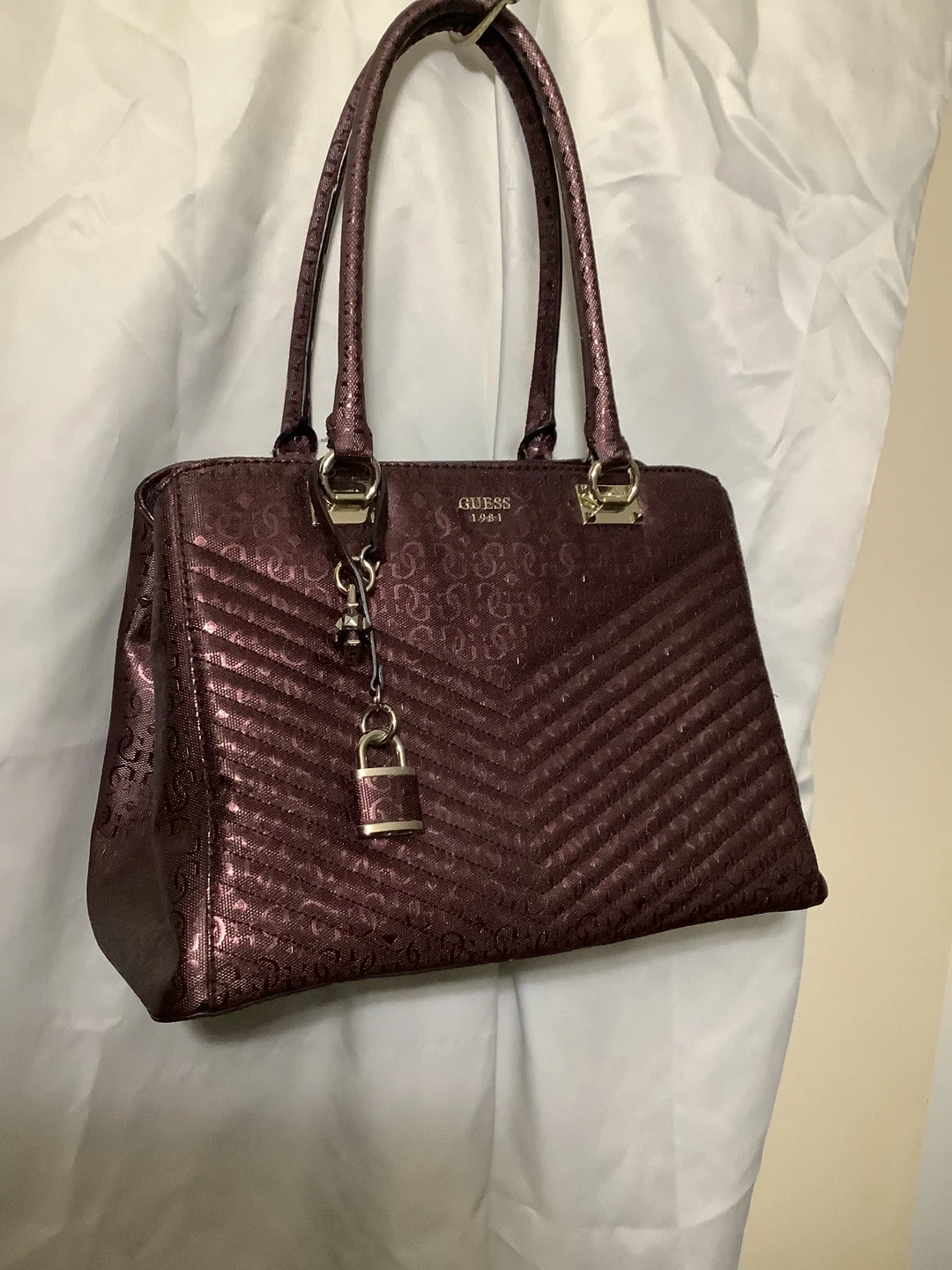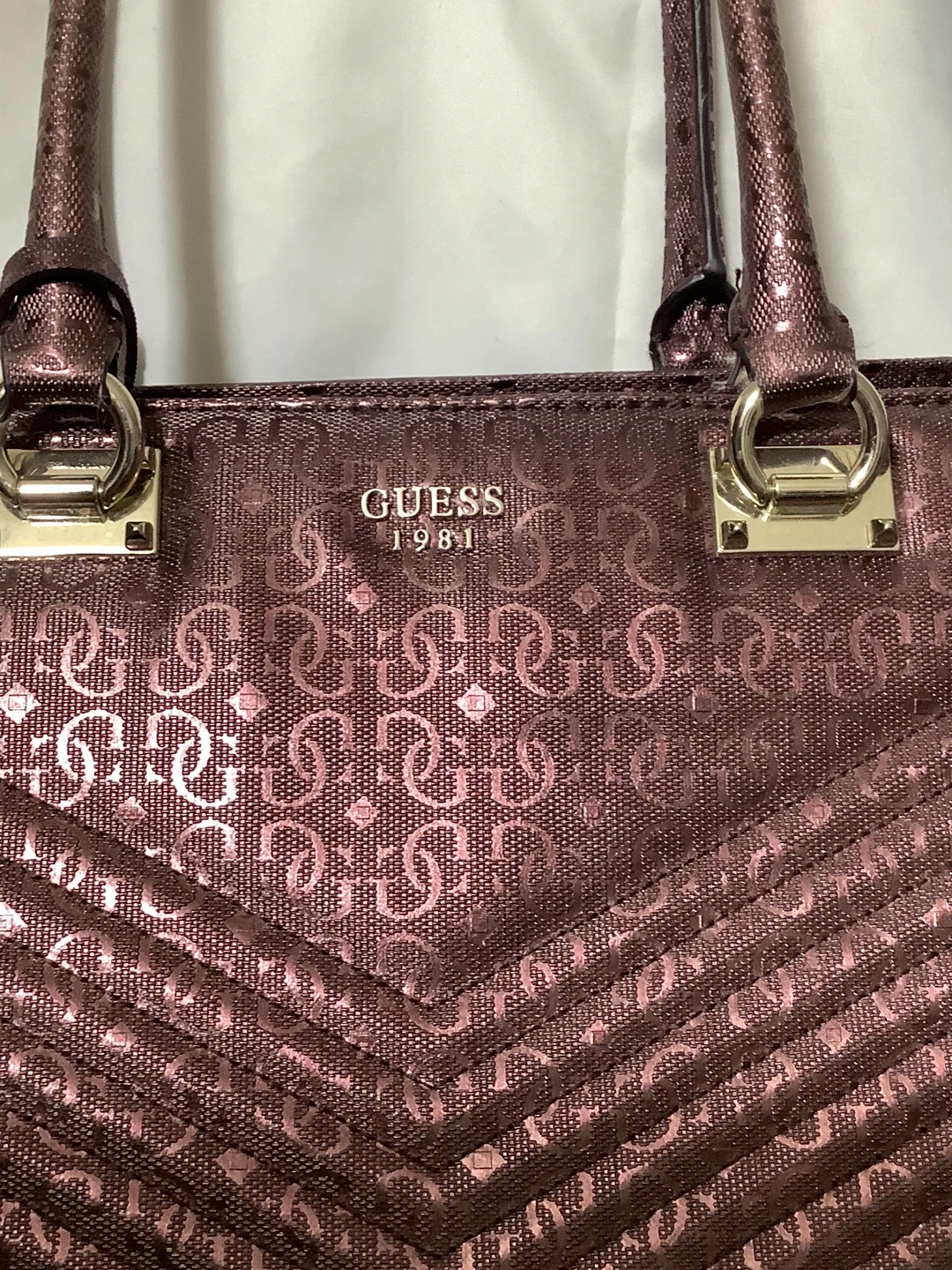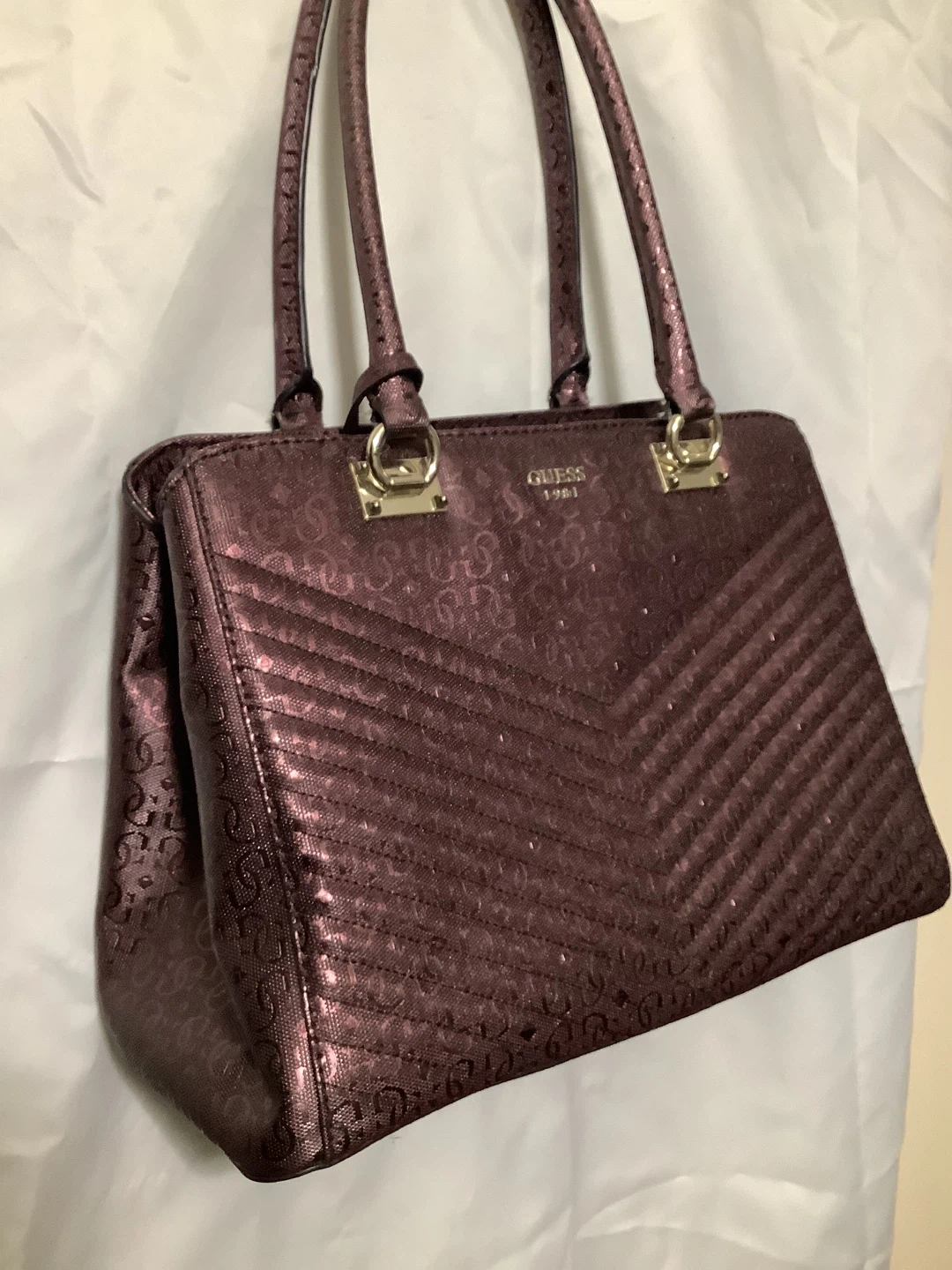 Authentic Guess handbag – bold and stylish Shiny metallic burgundy finish with embossed Guess “4G” logo pattern Quilted chevron design for a modern luxe look Structured tote style with double top handles Spacious interior – fits wallet, phone, makeup, and more Gold-tone hardware with Guess logo plate Location: Bronx, NY – Serious Buyers Only Pickup & Delivery Available Deposit required to hold