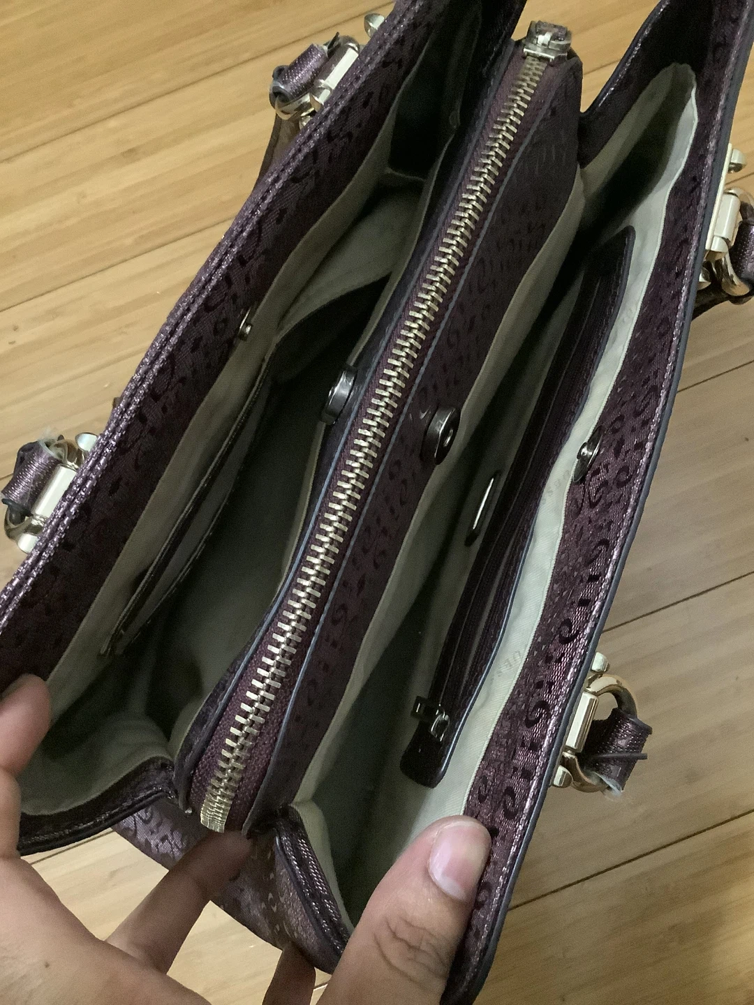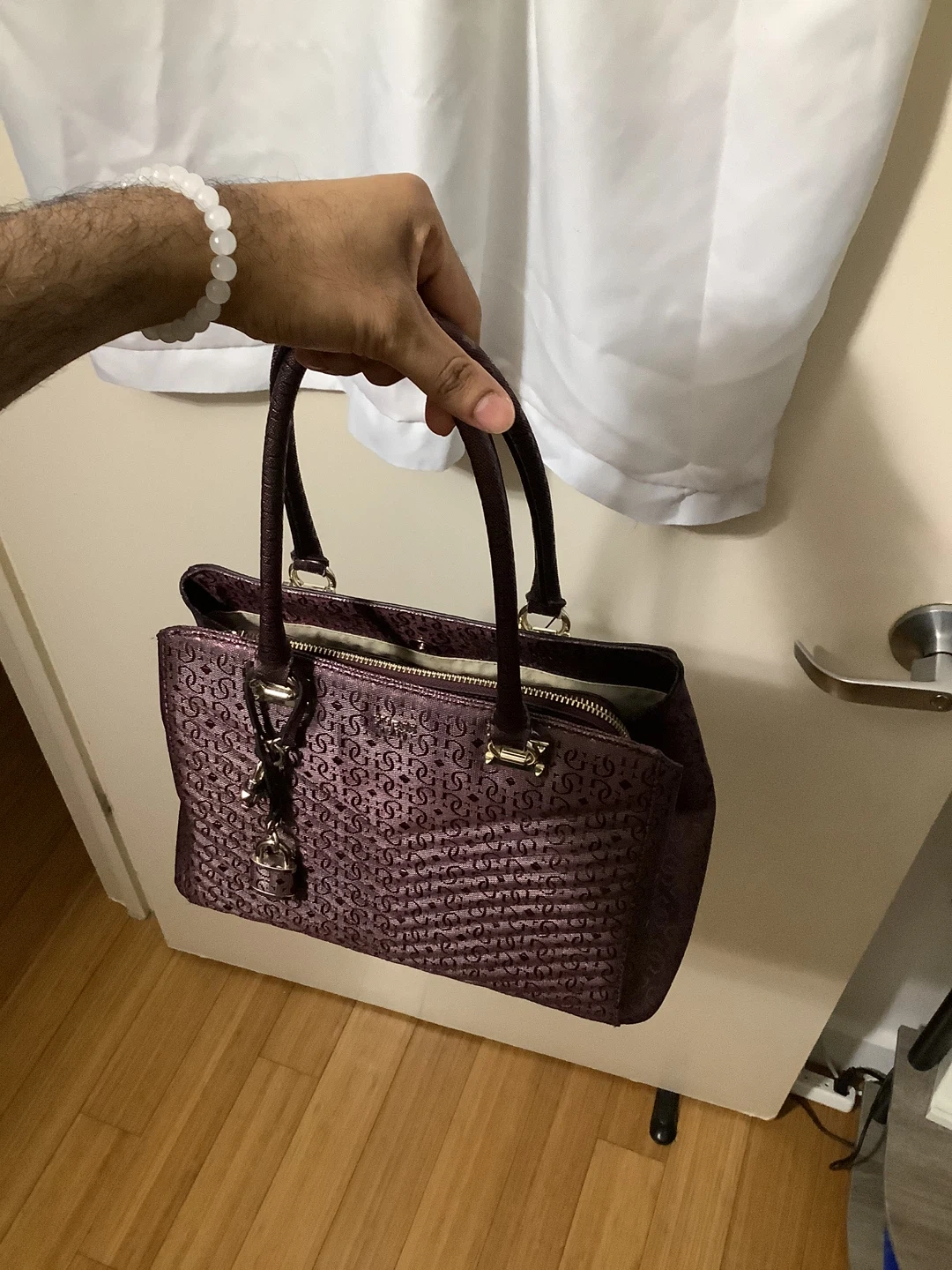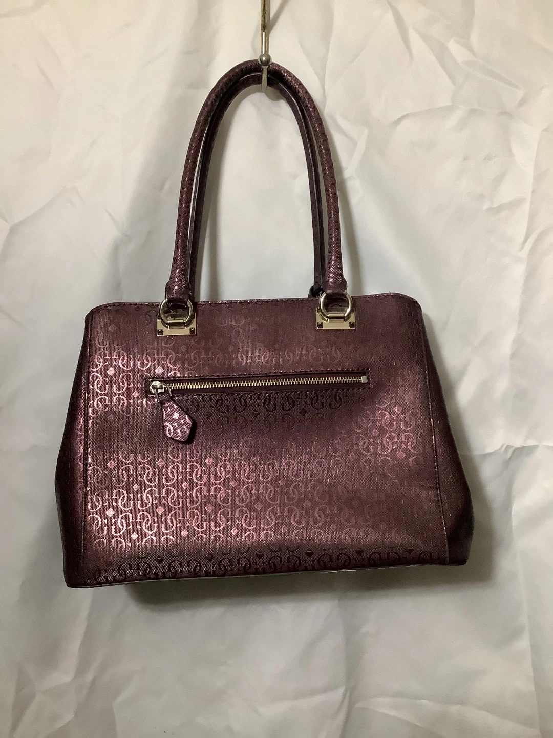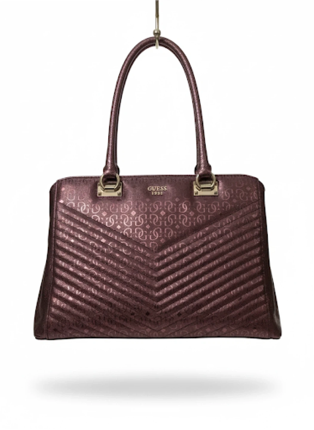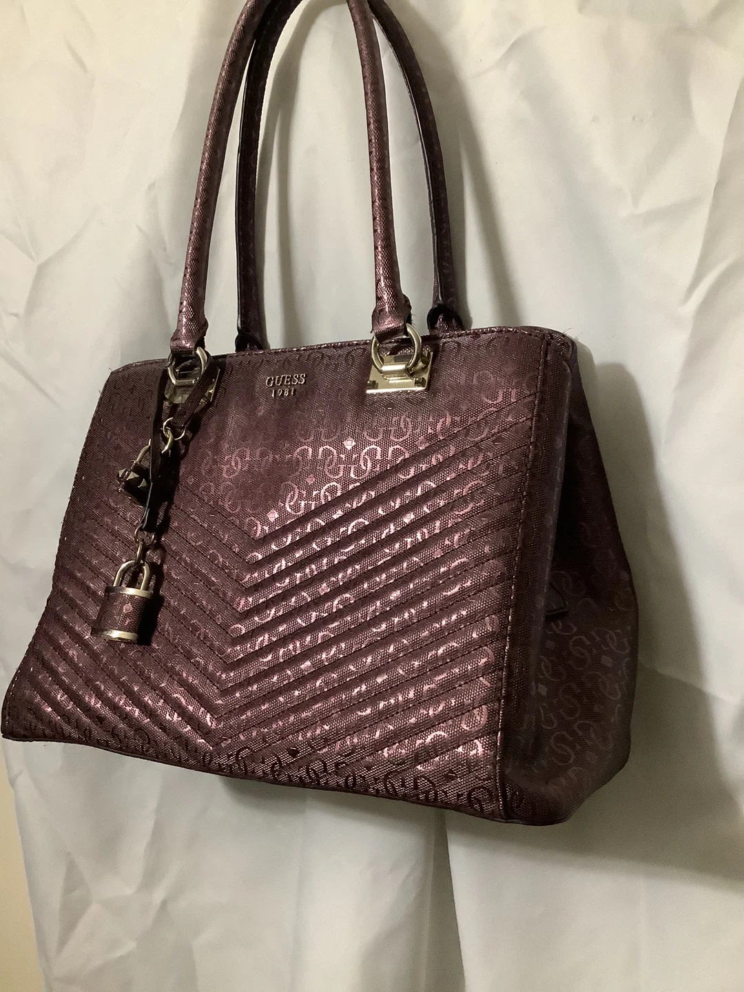 Authentic Guess handbag – bold and stylish Shiny metallic burgundy finish with embossed Guess “4G” logo pattern Quilted chevron design for a modern luxe look Structured tote style with double top handles Spacious interior – fits wallet, phone, makeup, and more Gold-tone hardware with Guess logo plate Location: Bronx, NY – Serious Buyers Only Pickup & Delivery Available Deposit required to hold