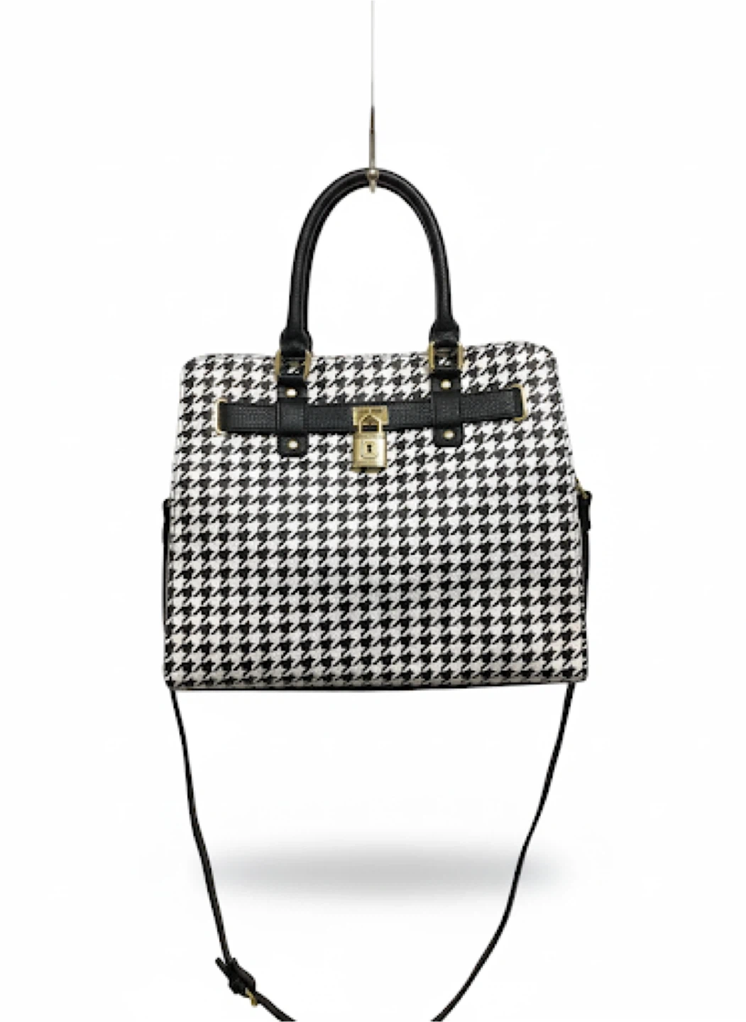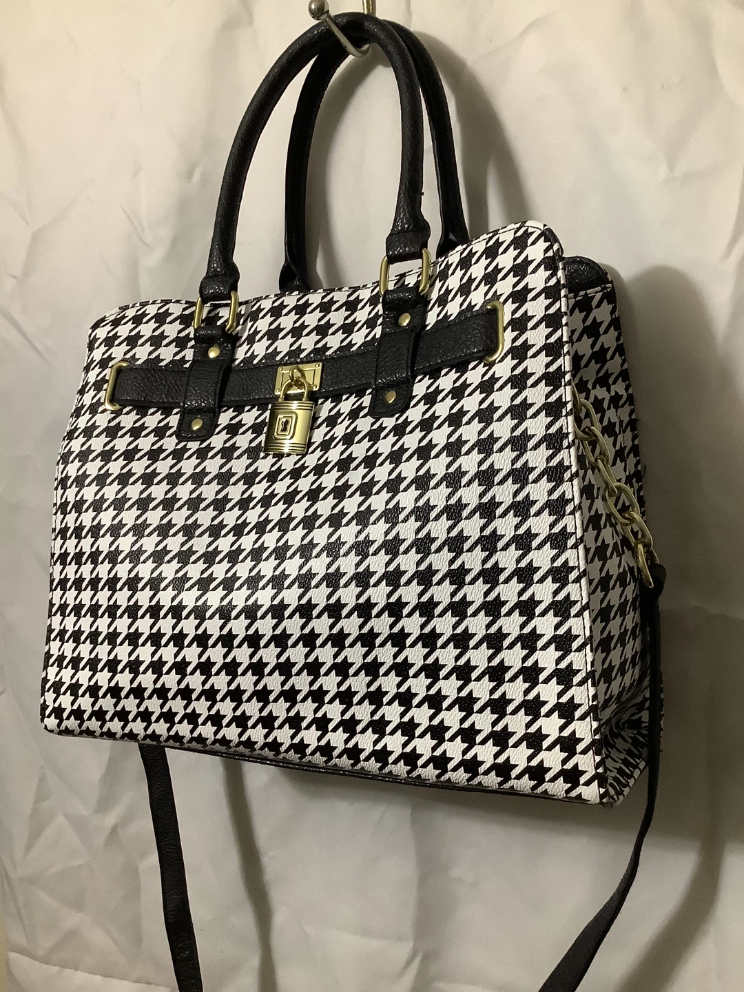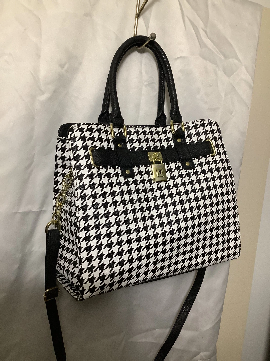Chic black-and-white houndstooth pattern with black faux leather trim Structured satchel design with gold-tone lock accent Dual carry options – sturdy top handles + adjustable crossbody strap Spacious interior for wallet, phone, keys & daily essentials Elegant and versatile – perfect for work, casual outings, or evening wear Location: Bronx, NY – Serious Buyers Only Pickup & Delivery Available Deposit required to hold