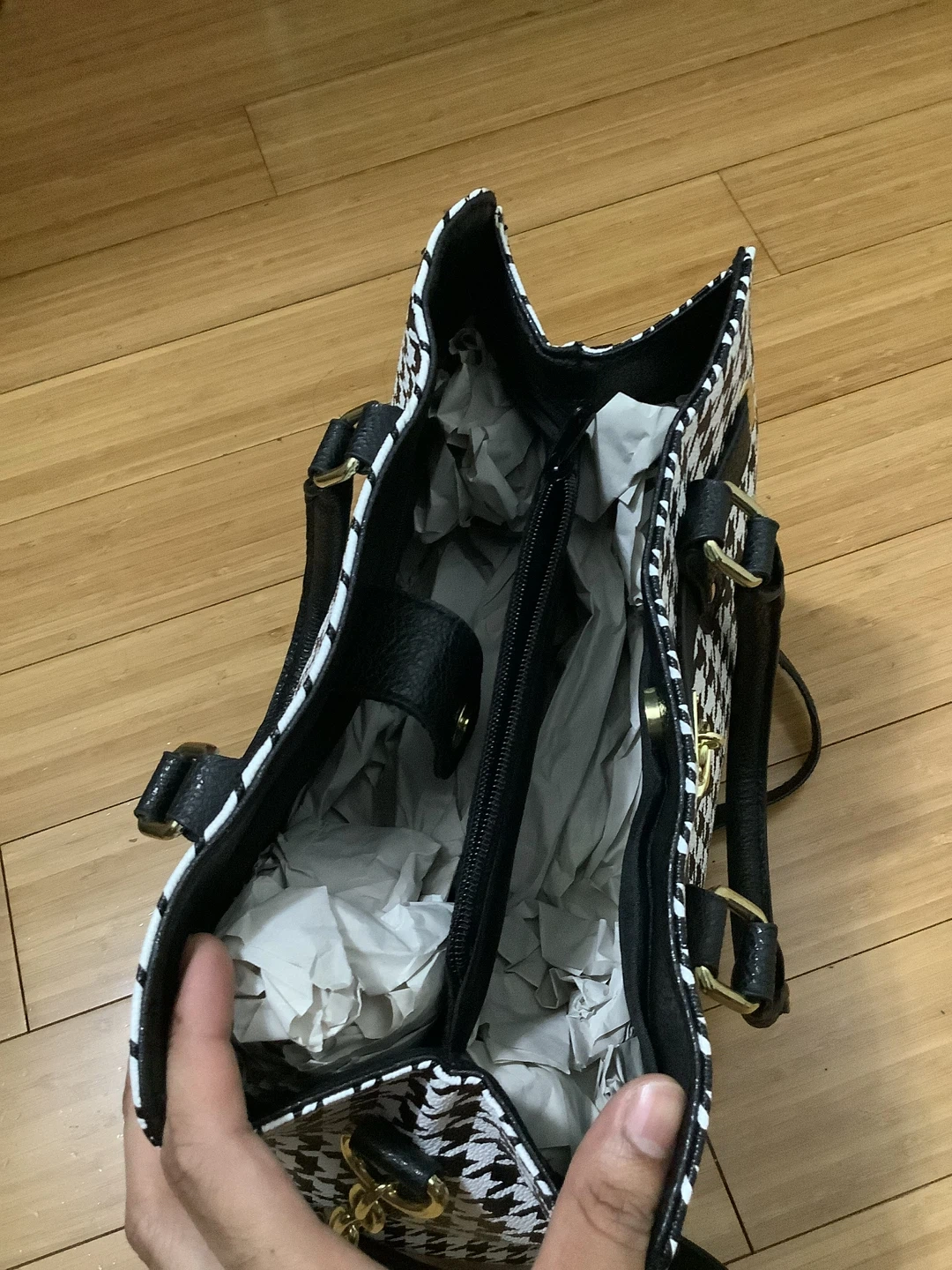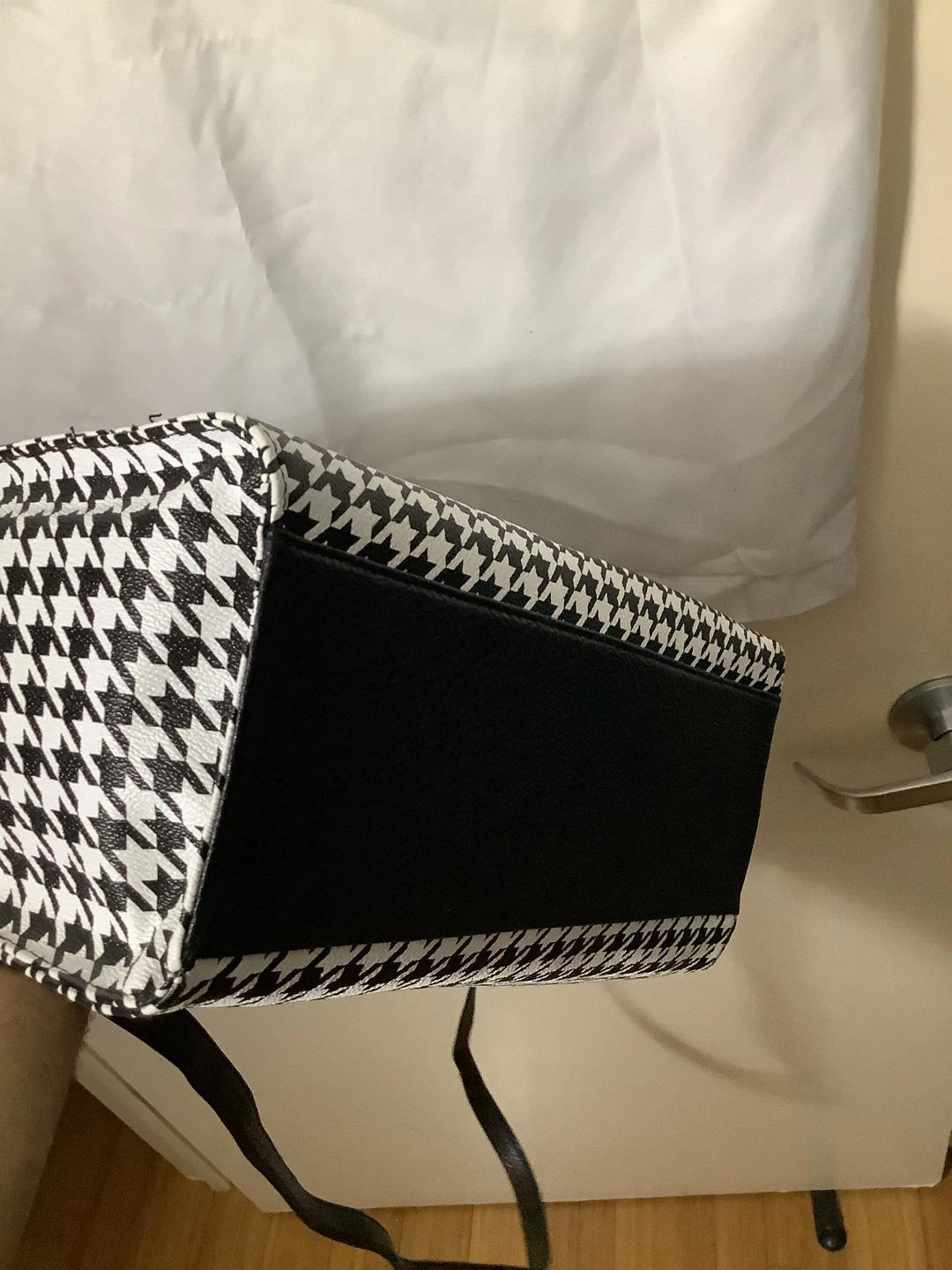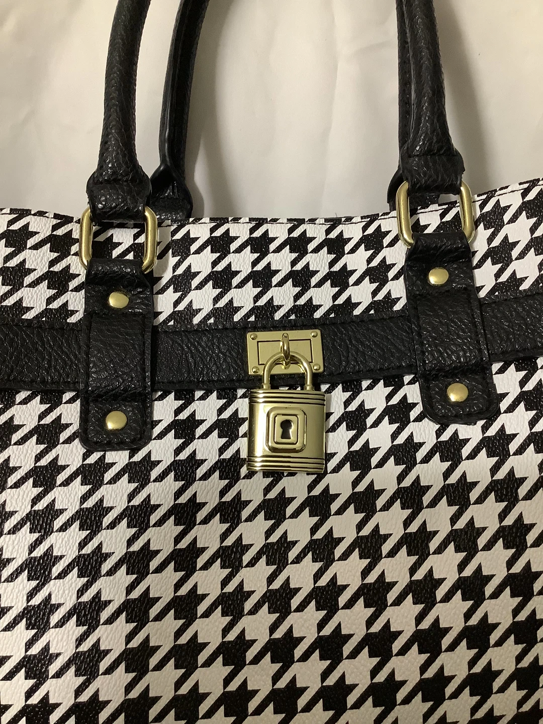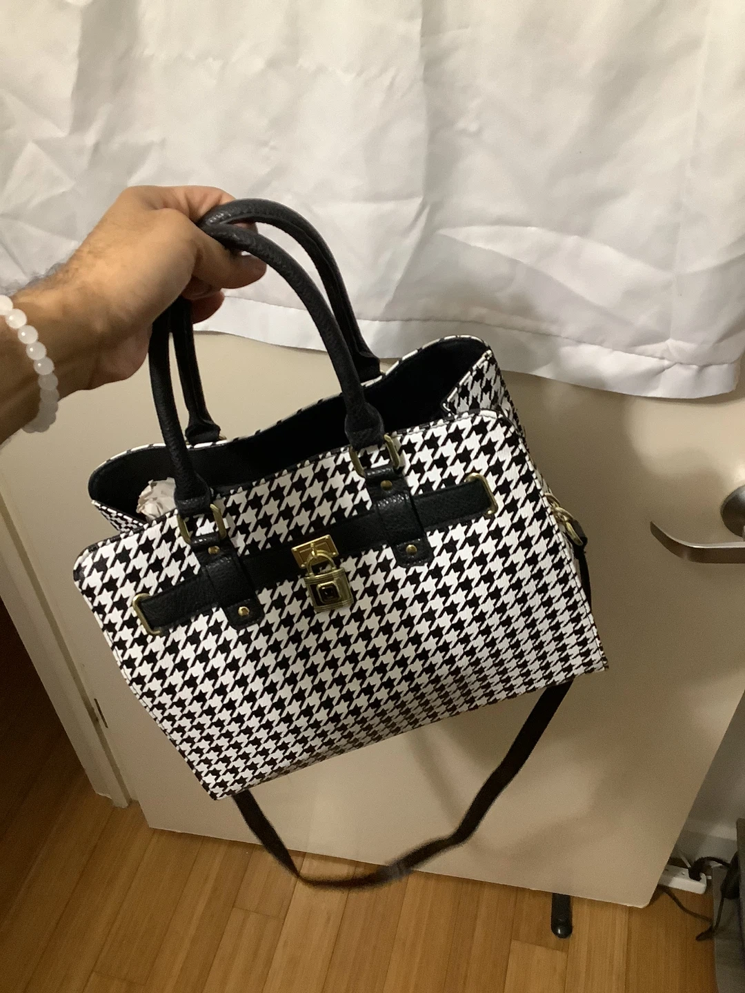 Chic black-and-white houndstooth pattern with black faux leather trim Structured satchel design with gold-tone lock accent Dual carry options – sturdy top handles + adjustable crossbody strap Spacious interior for wallet, phone, keys & daily essentials Elegant and versatile – perfect for work, casual outings, or evening wear Location: Bronx, NY – Serious Buyers Only Pickup & Delivery Available Deposit required to hold