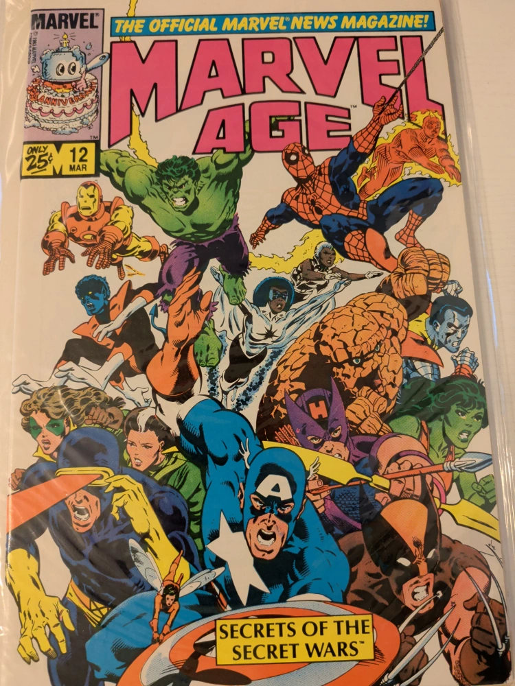 Selling a vintage Marvel Age #12 comic book! It features a bunch of classic characters like Spider-Man, Hulk, Captain America, and Wolverine. This issue is titled "Secrets of the Secret Wars."