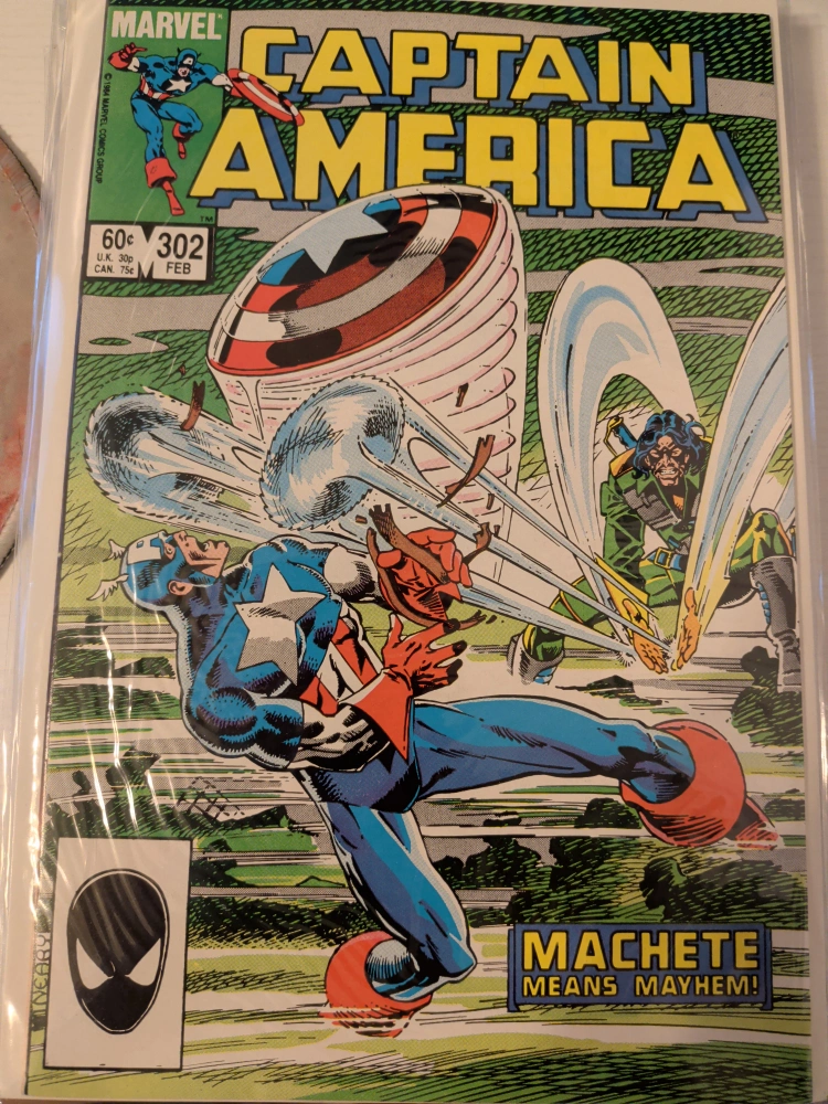 Selling a Captain America comic book, issue #302 from Marvel Comics! This comic is from February and features the storyline 'Machete Means Mayhem!' It's in great condition for its age, a cool find for any comic collector