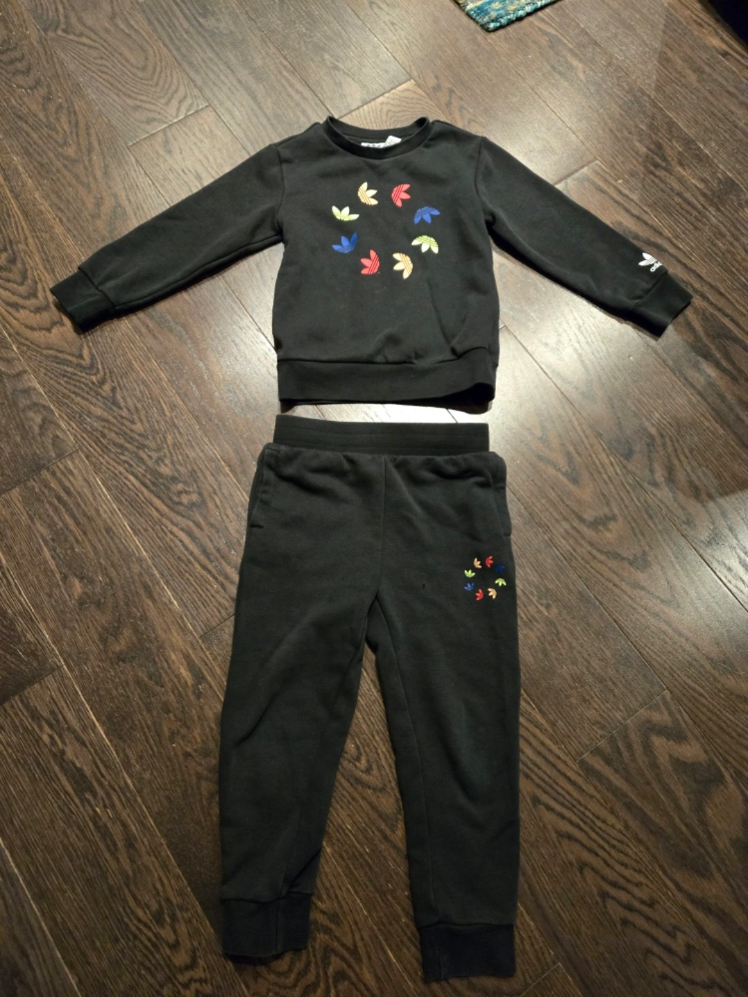 Selling a cute Adidas tracksuit for kids in size 4T. It's black with a colourful leaf design. Perfect for keeping your little one comfy and stylish. The set includes a sweatshirt and matching pants. Great condition!