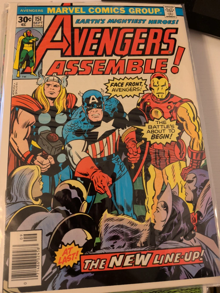Selling a vintage Marvel Comics Group Avengers Assemble! comic book, issue #151. This comic features Earth's Mightiest Heroes in "The New Line-Up!"