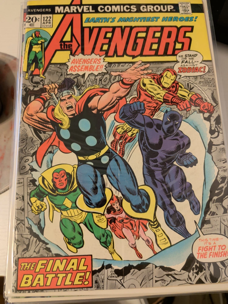 Selling Avengers comic book #122. It's from the Marvel Comics Group and features Earth's Mightiest Heroes! The cover says 'Avengers Assemble!!' and 'The Final Battle!'