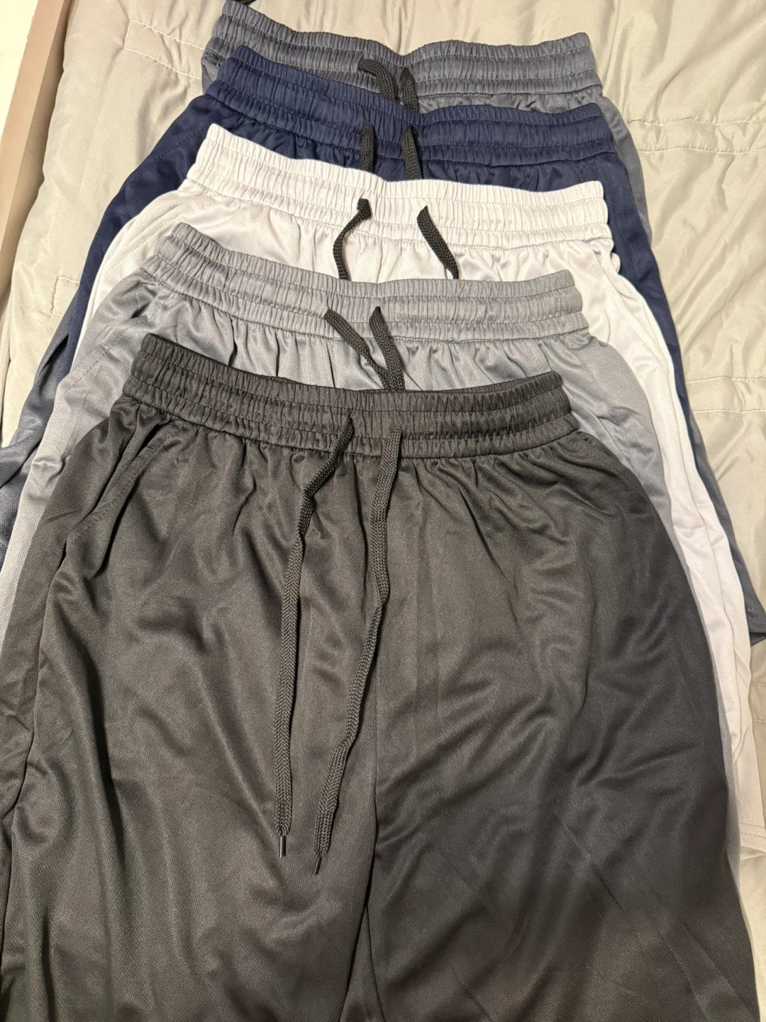 Selling a pair of athletic shorts in black. They're in great condition and ready for your next workout or just lounging around. The shorts have a comfortable elastic waistband with a drawstring for a secure fit. Perfect for sports or casual wear!