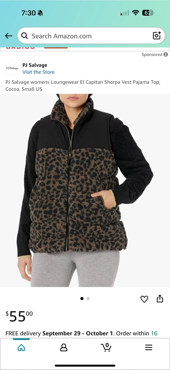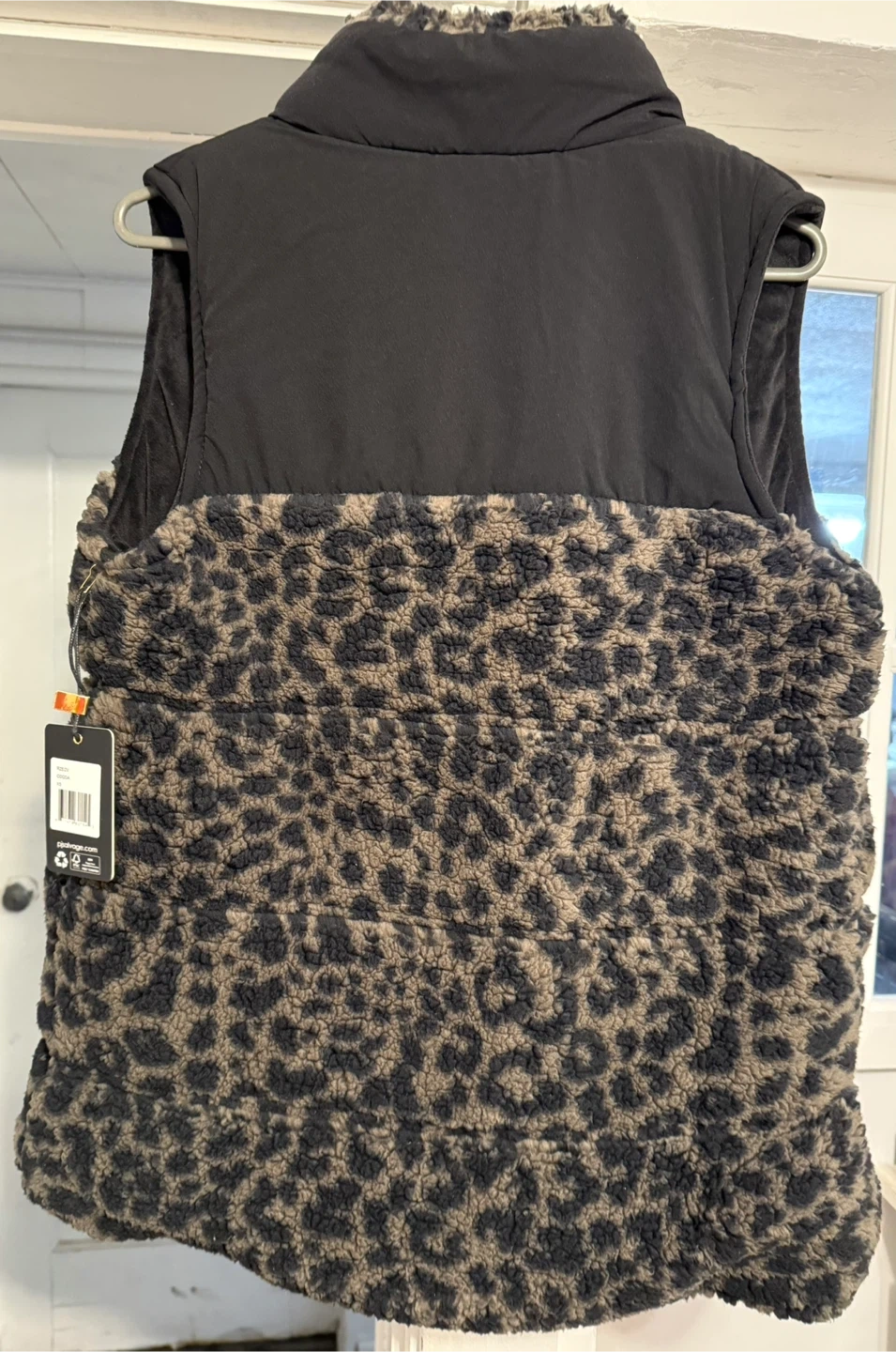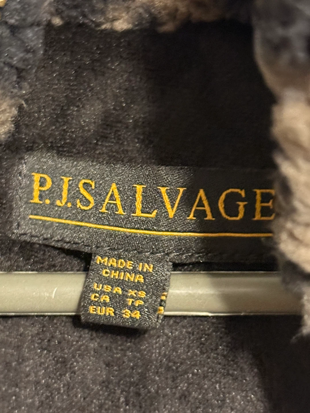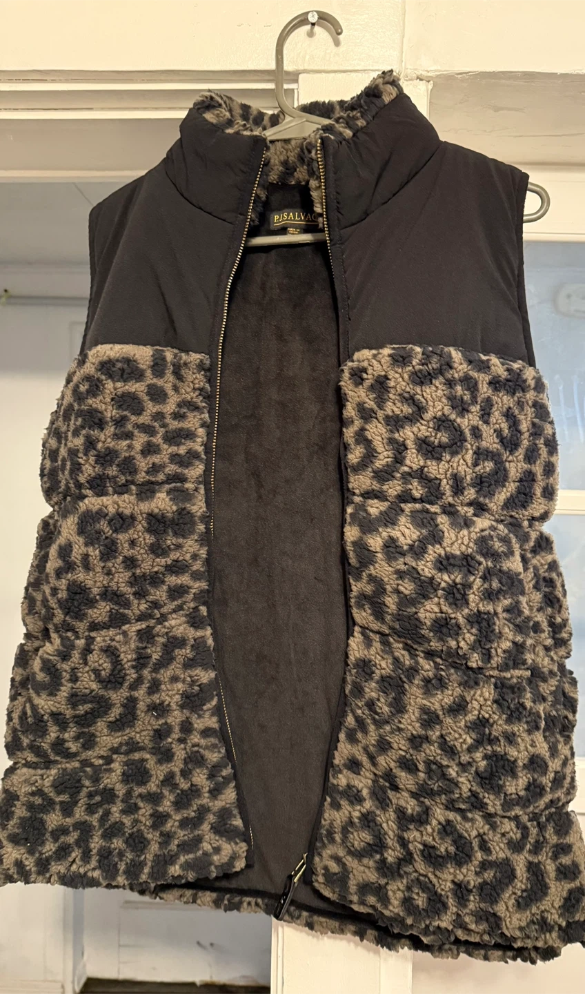 Cozy PJ Salvage El Capitan Sherpa Vest in size XS! This vest features a stylish leopard print sherpa design on the front and back, with a black upper portion and lining. Perfect for adding a layer of warmth and style to your loungewear or casual outfits