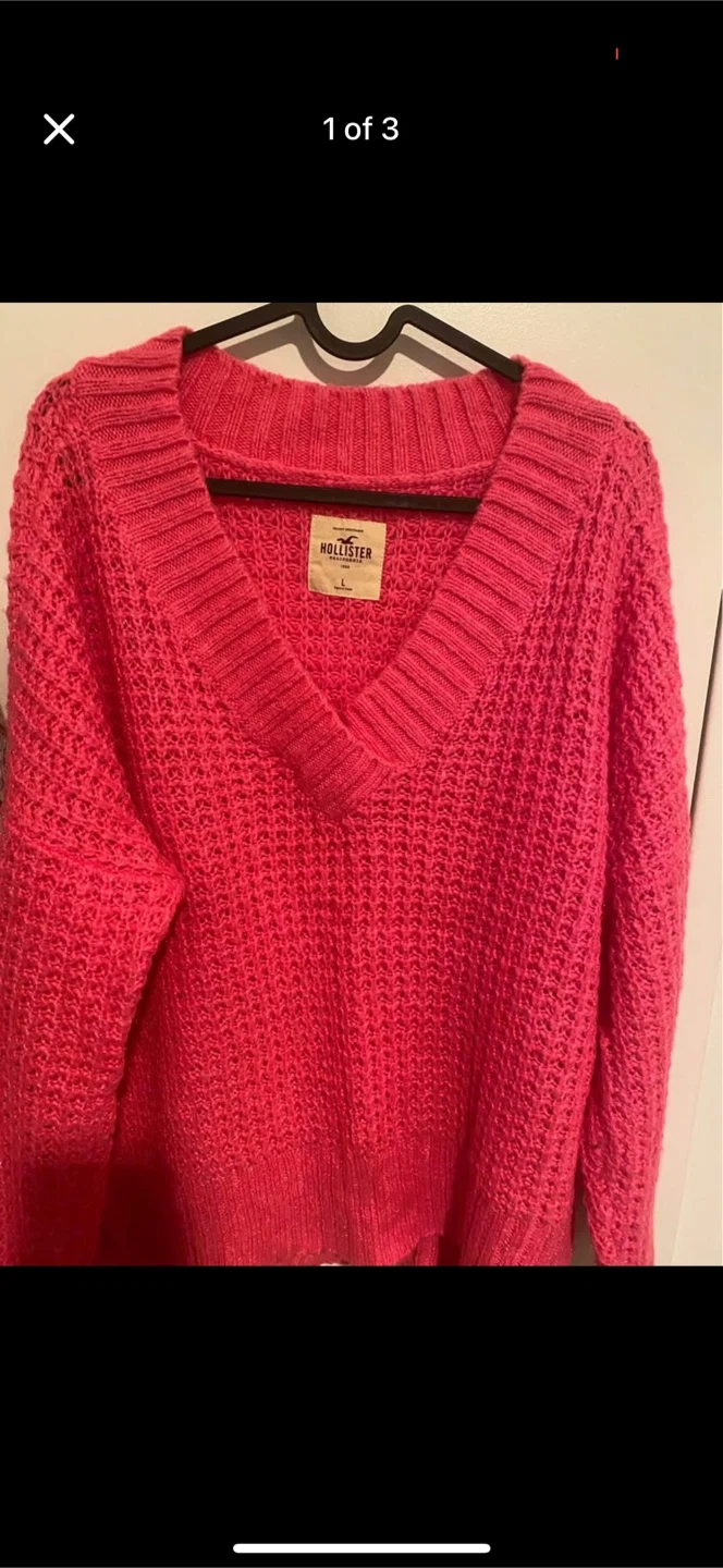 Selling a cute Hollister sweater in a bright pink color! It's a V-neck style and size large.