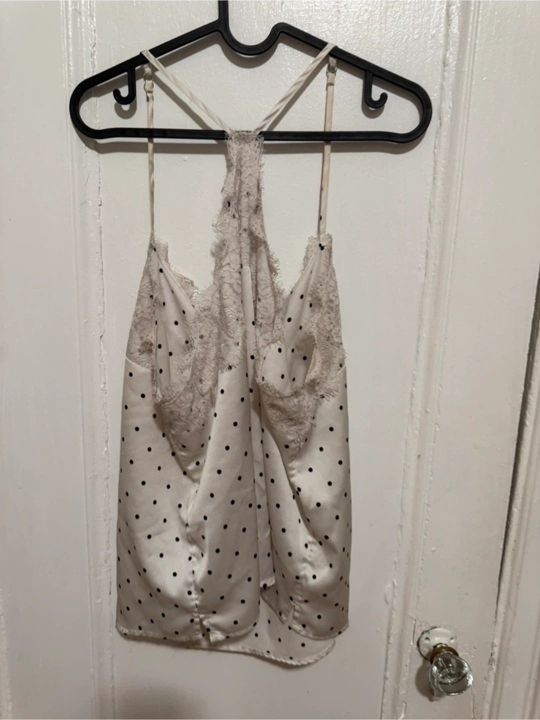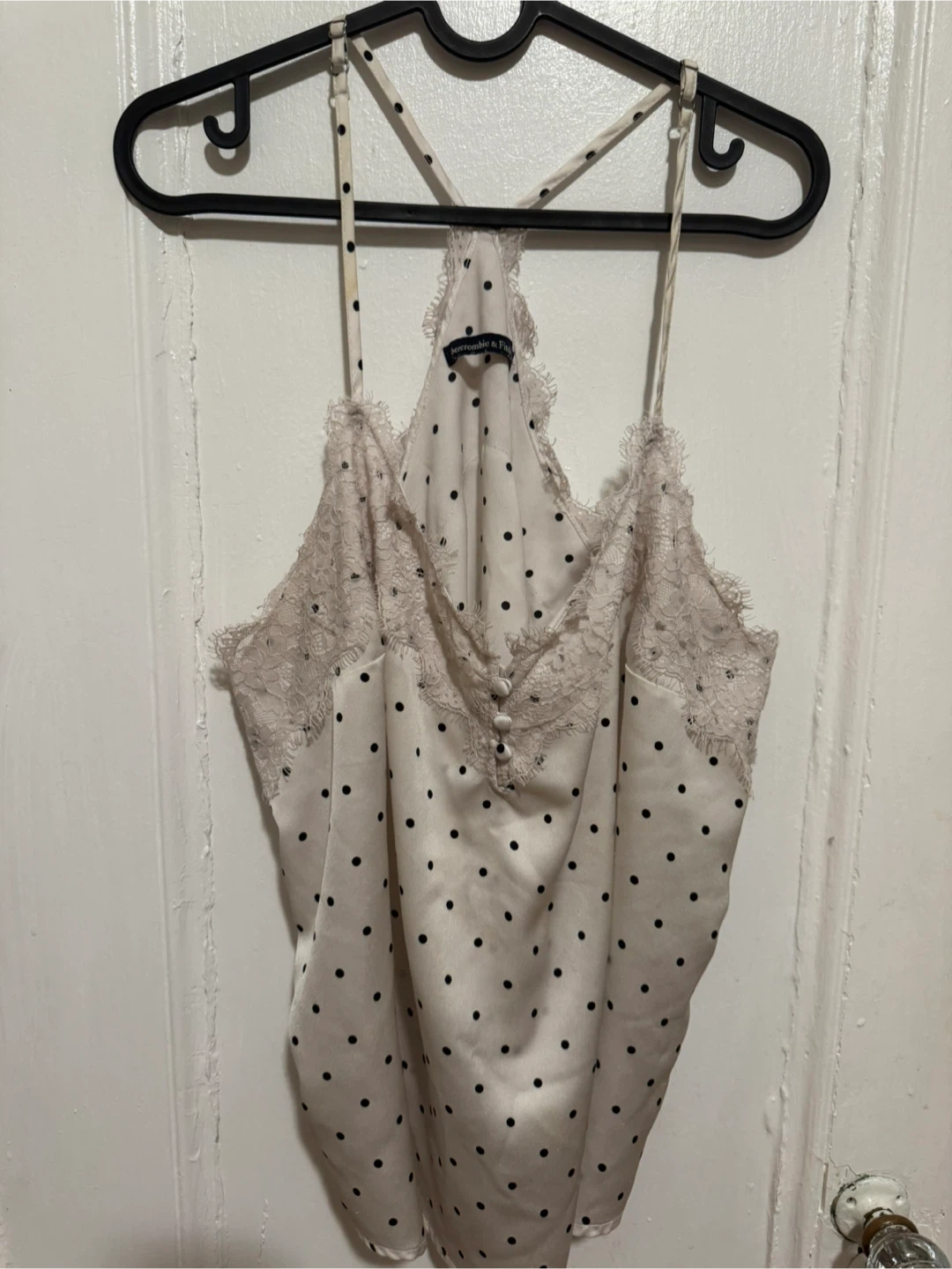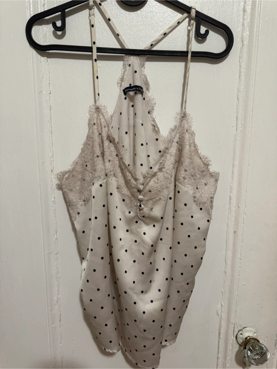 128Cute Abercrombie & Fitch cami with a polka dot pattern. It features lace detailing around the neckline. Perfect for a night out or layering!