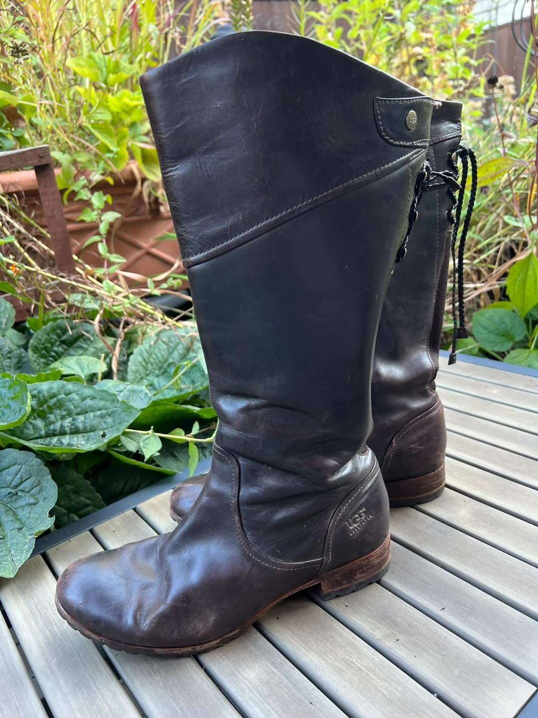 Selling a pair of UGG Australia knee-high boots! They are brown leather with a side zipper and decorative laces at the back. These boots are in fair condition and ready for a new home