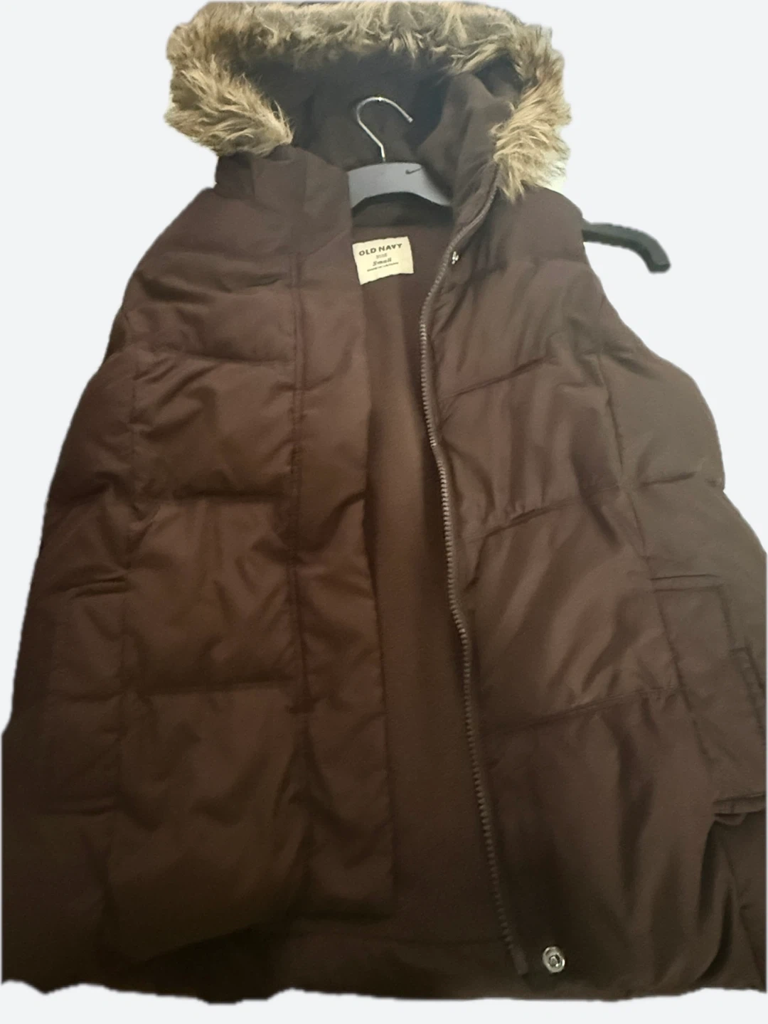 Selling a gently used Old Navy puffer vest in a dark brown color. It features a faux fur hood, adding a touch of warmth and style. The size is Small. Perfect for layering during the cooler months!