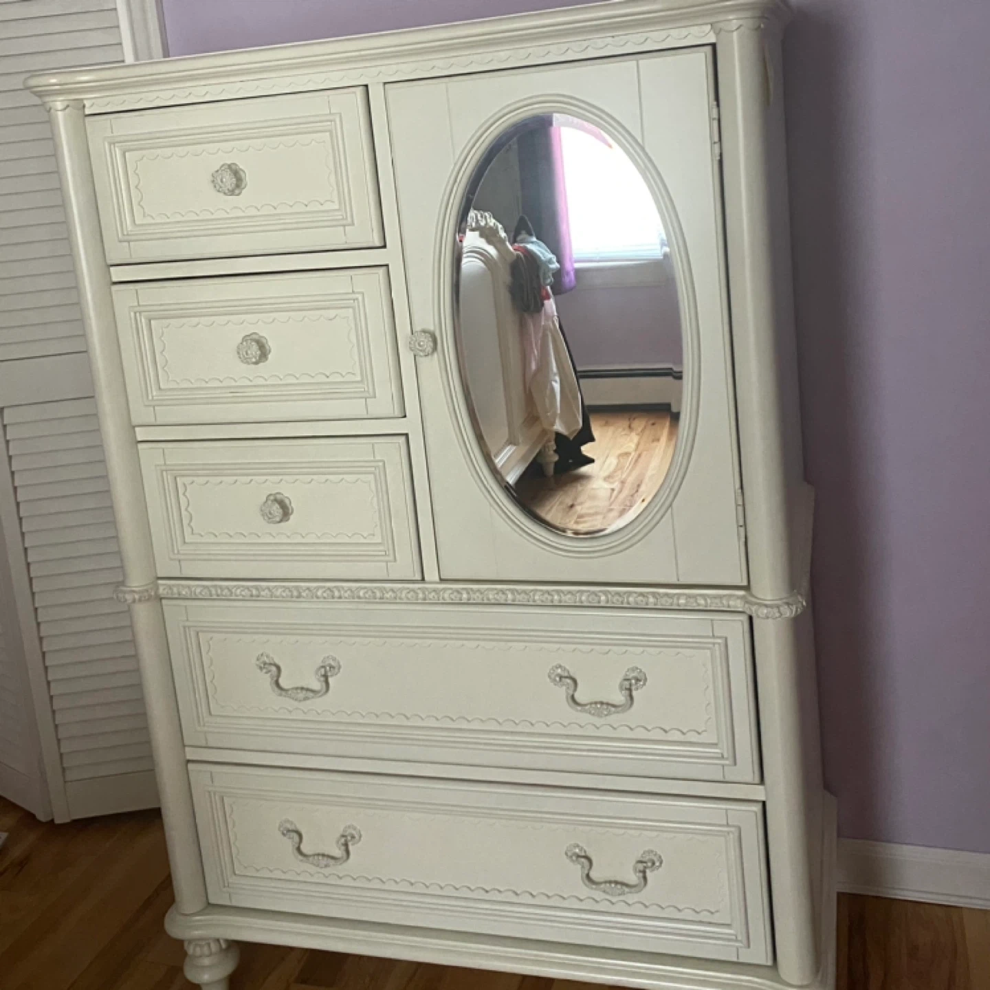 This is a beautiful armoire dresser in a creamy white color. It features several drawers for storage and a mirrored door on one side. It's perfect for adding a touch of elegance to any bedroom!